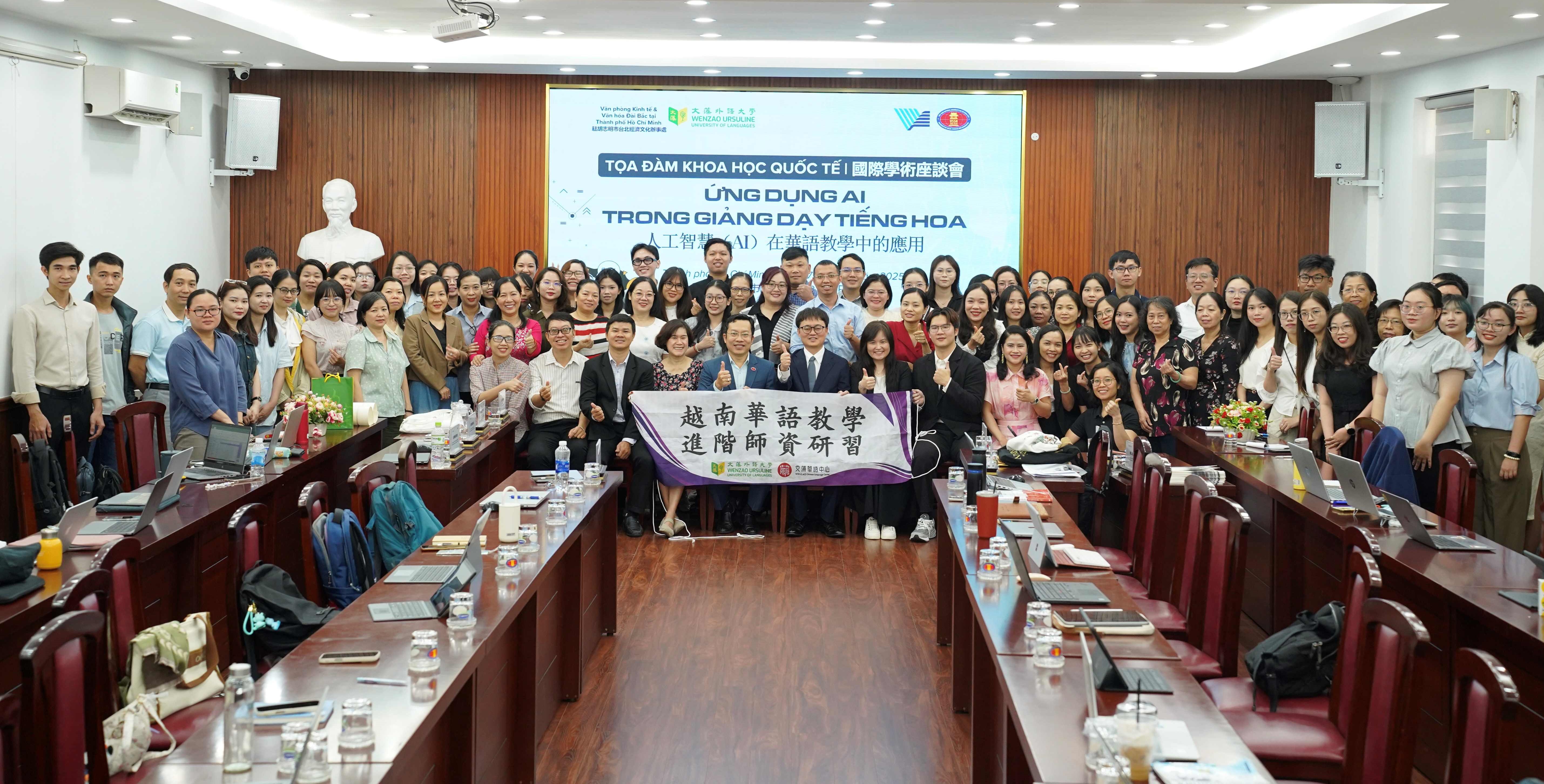 文藻外語大學華語中心攜手越南胡志明市國家大學下屬人文與社會科學大學,在我駐胡志明市臺北經濟文化辦事處教育組支持下,於114年12月下旬共同舉辦「華語教師進階師資研習工作坊」,吸引越南南部多個城市近百名華語教師參與,現場氣氛熱絡。
