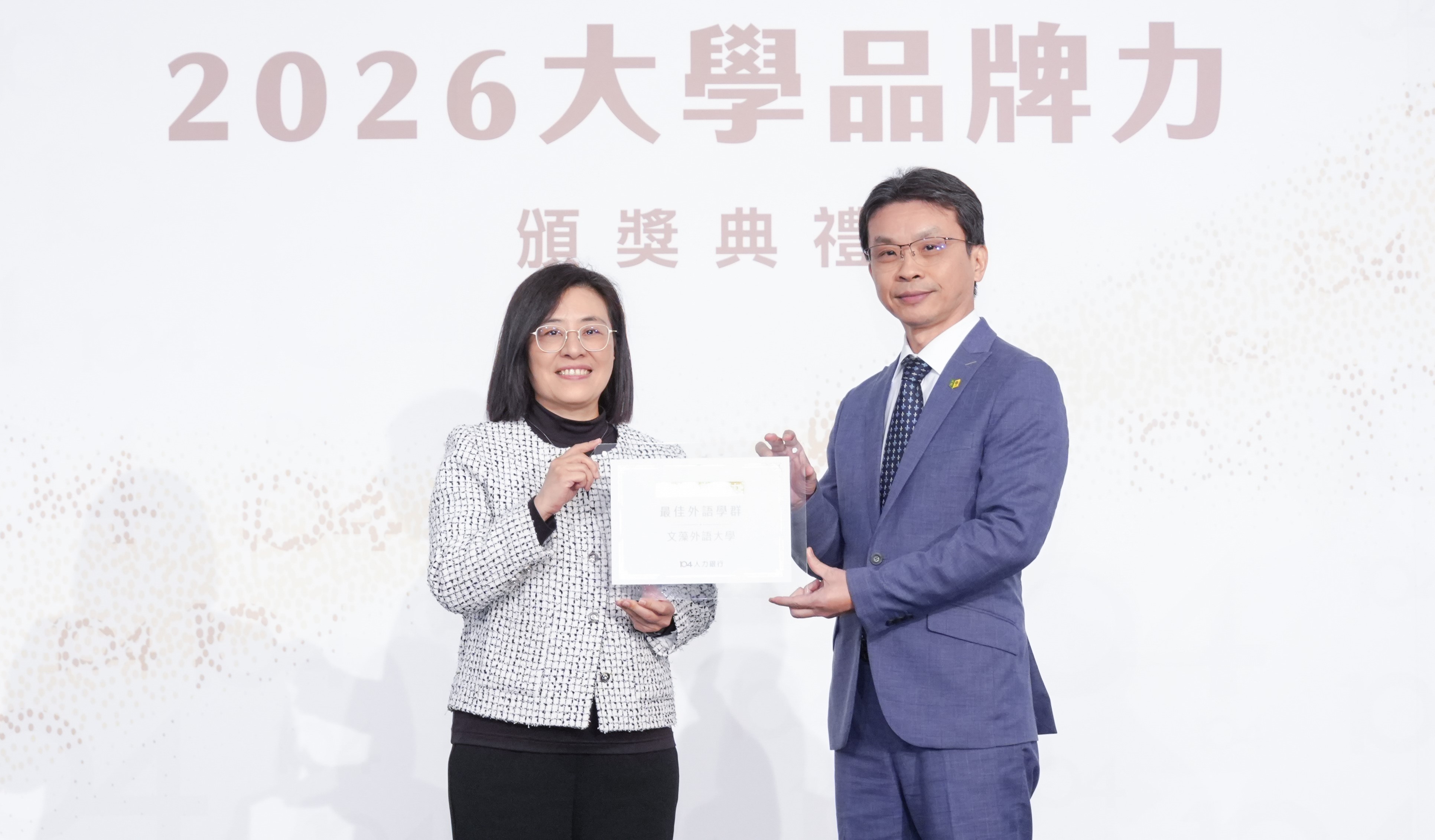 文藻外語大學培育跨域國際人才的成果再獲肯定!104人力銀行公布2026年「大學品牌力」報告,文藻外語大學於「最佳學群獎」項目中,榮獲外語領域全國私立大學第一名,展現文藻在語文專業、跨域整合與國際接軌等方面的優異辦學成果。