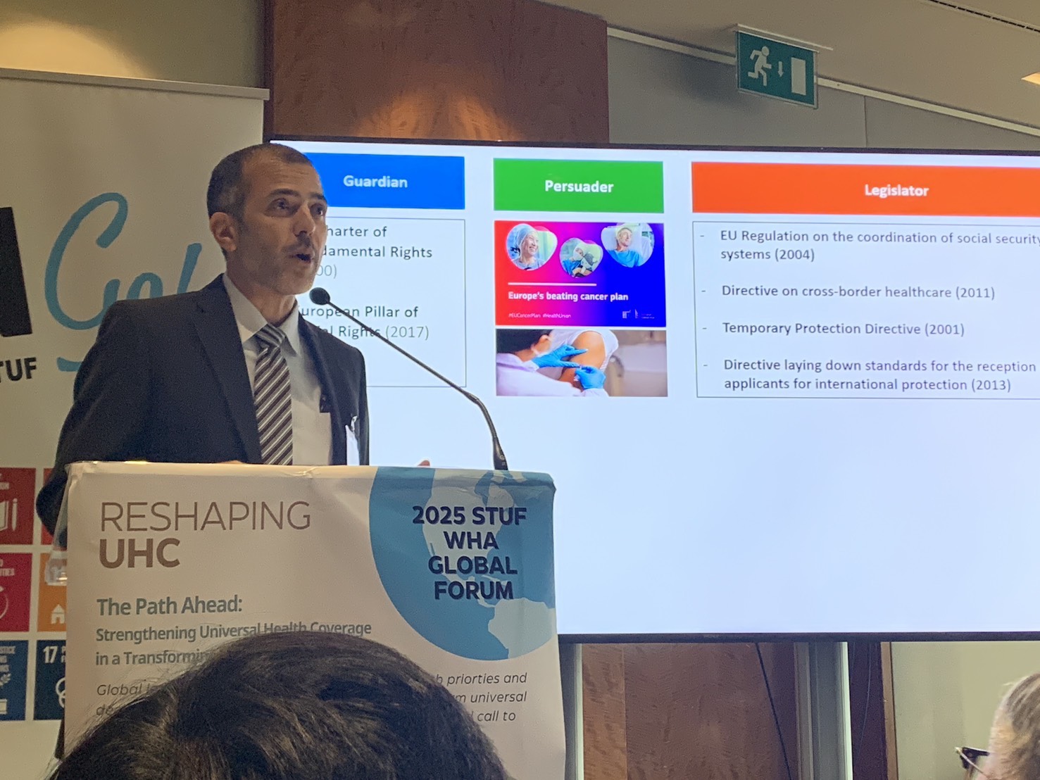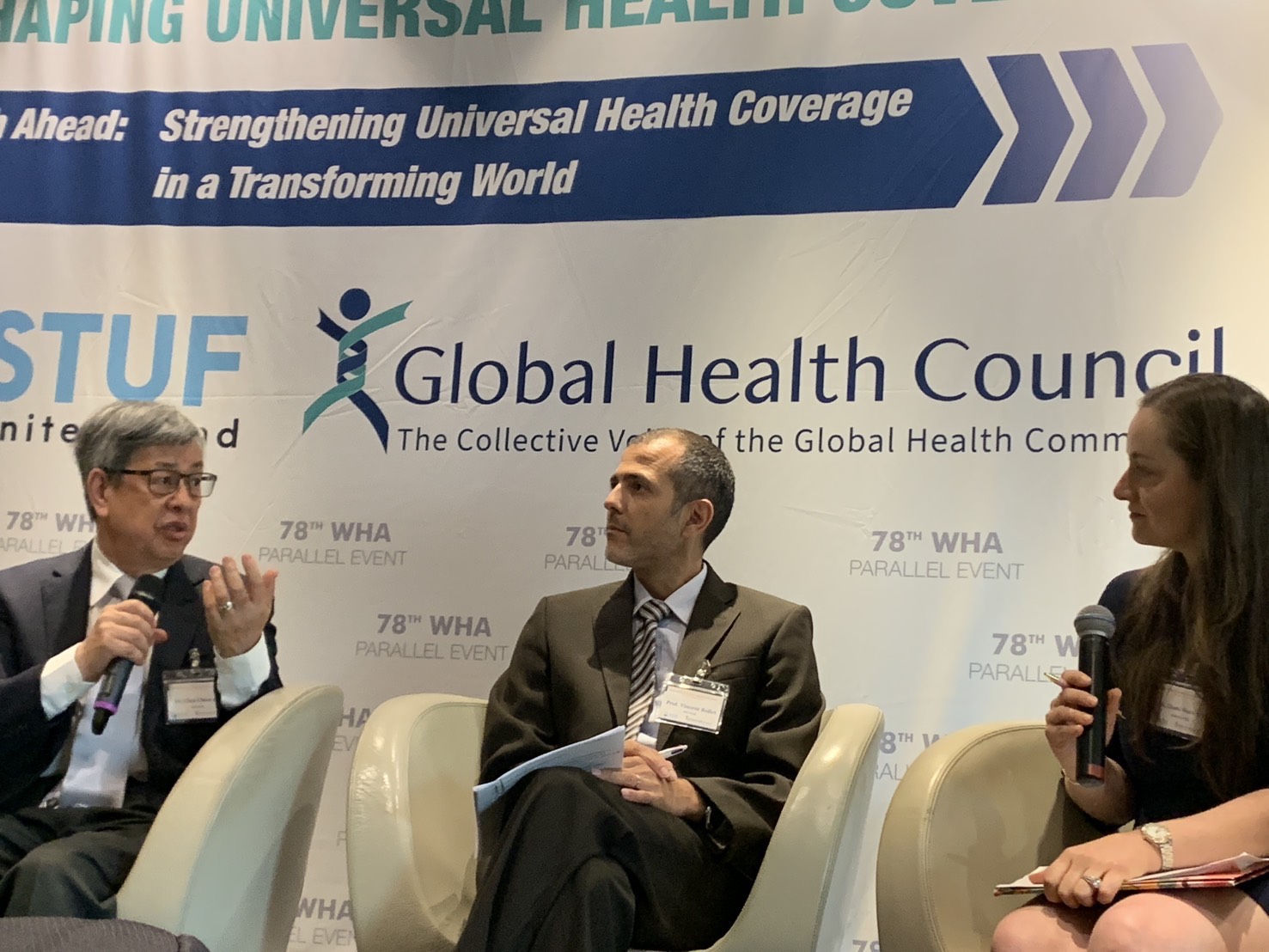 「2025 WHA全球論壇–重塑全民均健(Universal Health Coverage, UHC)」,討論歐、亞、非三洲的全民健康覆蓋情形,圖中為羅文笙教授。 |