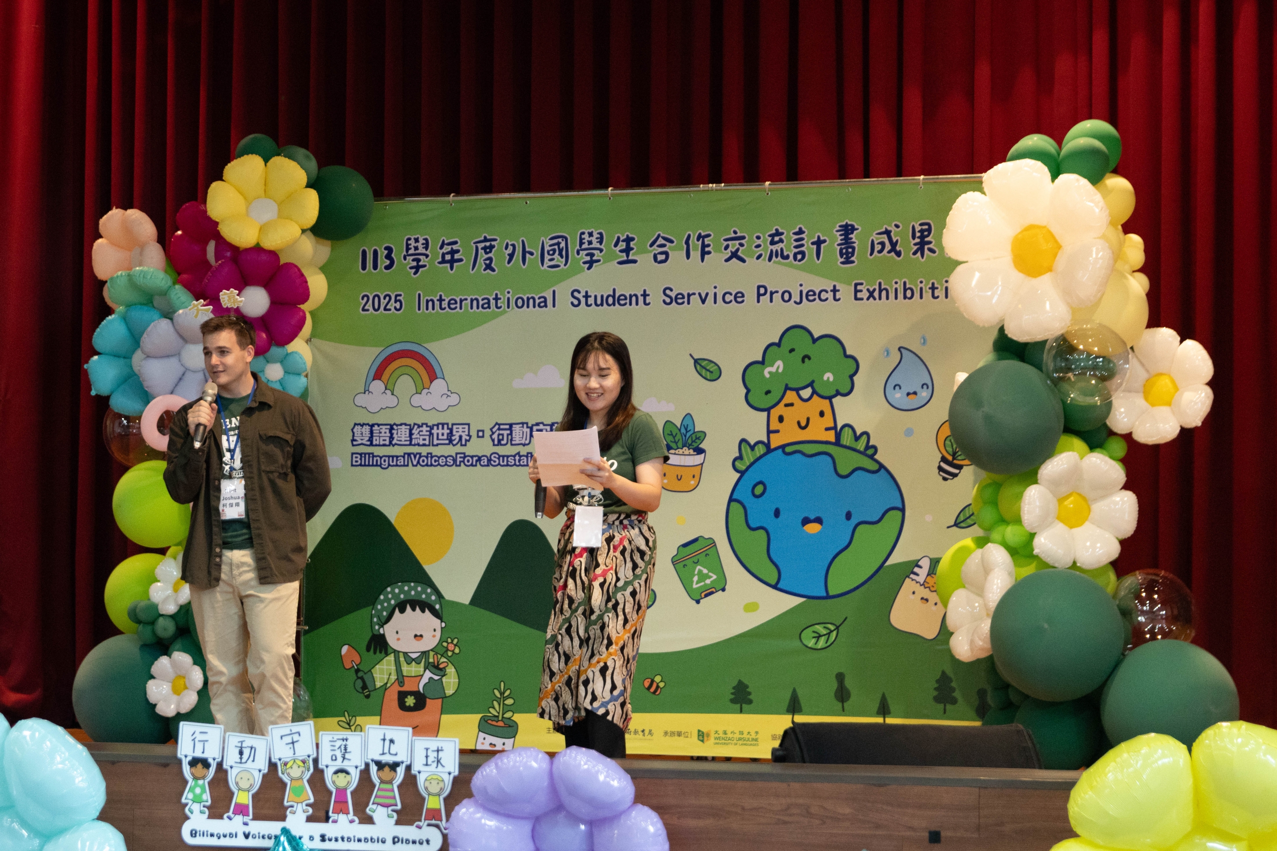 文藻學生來自南非的柯傑翔(左)及印尼生蔡佩雪(右)擔任成果展主持人 |