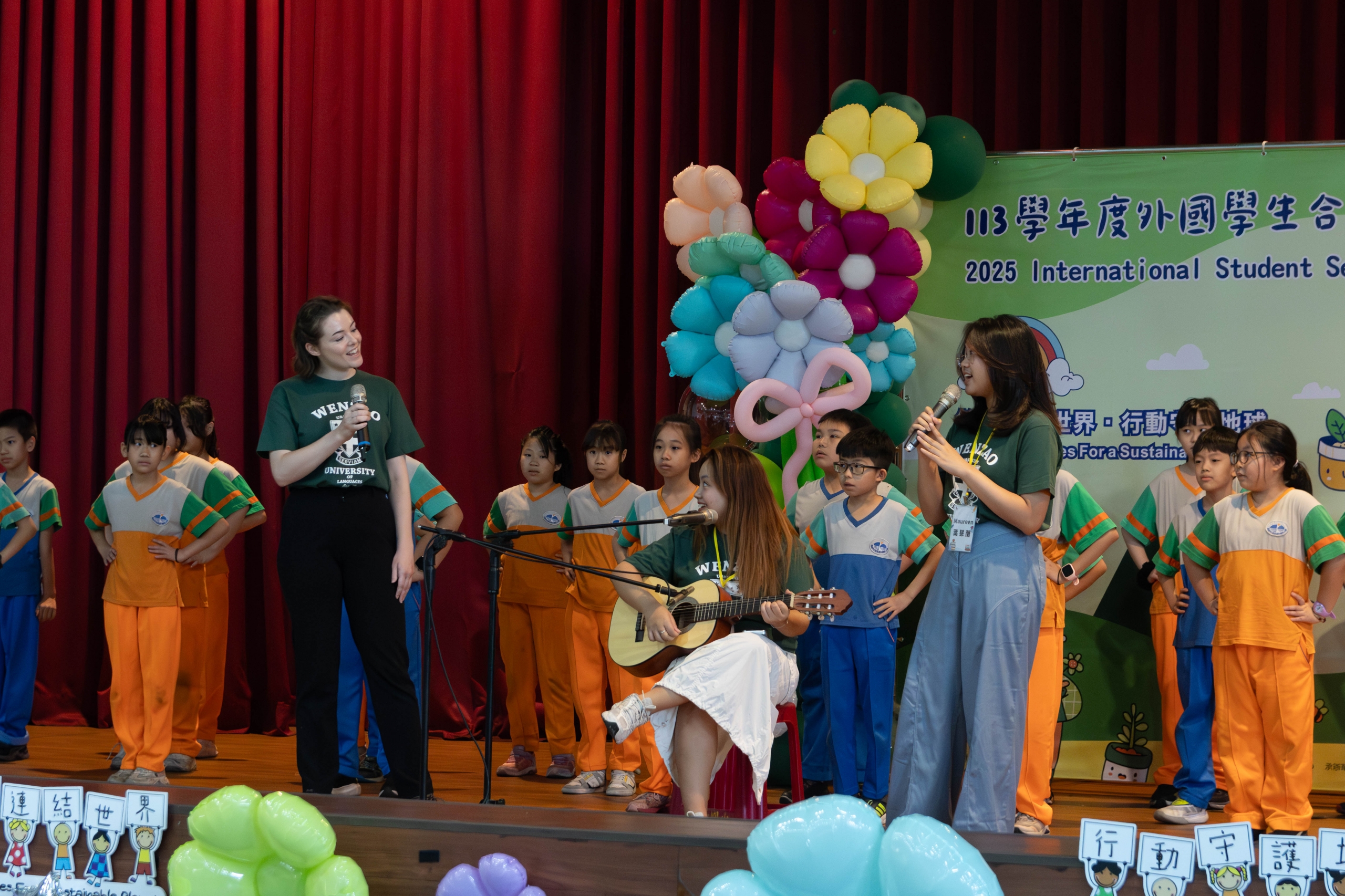 113學年度外國學生合作交流計畫成果展,由文藻外大外籍生Adelynn(中)吉他演奏,搭配加拿大籍學生Jessica和印尼籍學生Maureen優美歌聲,與港和國小學生一同演出 。相片提供/國合處