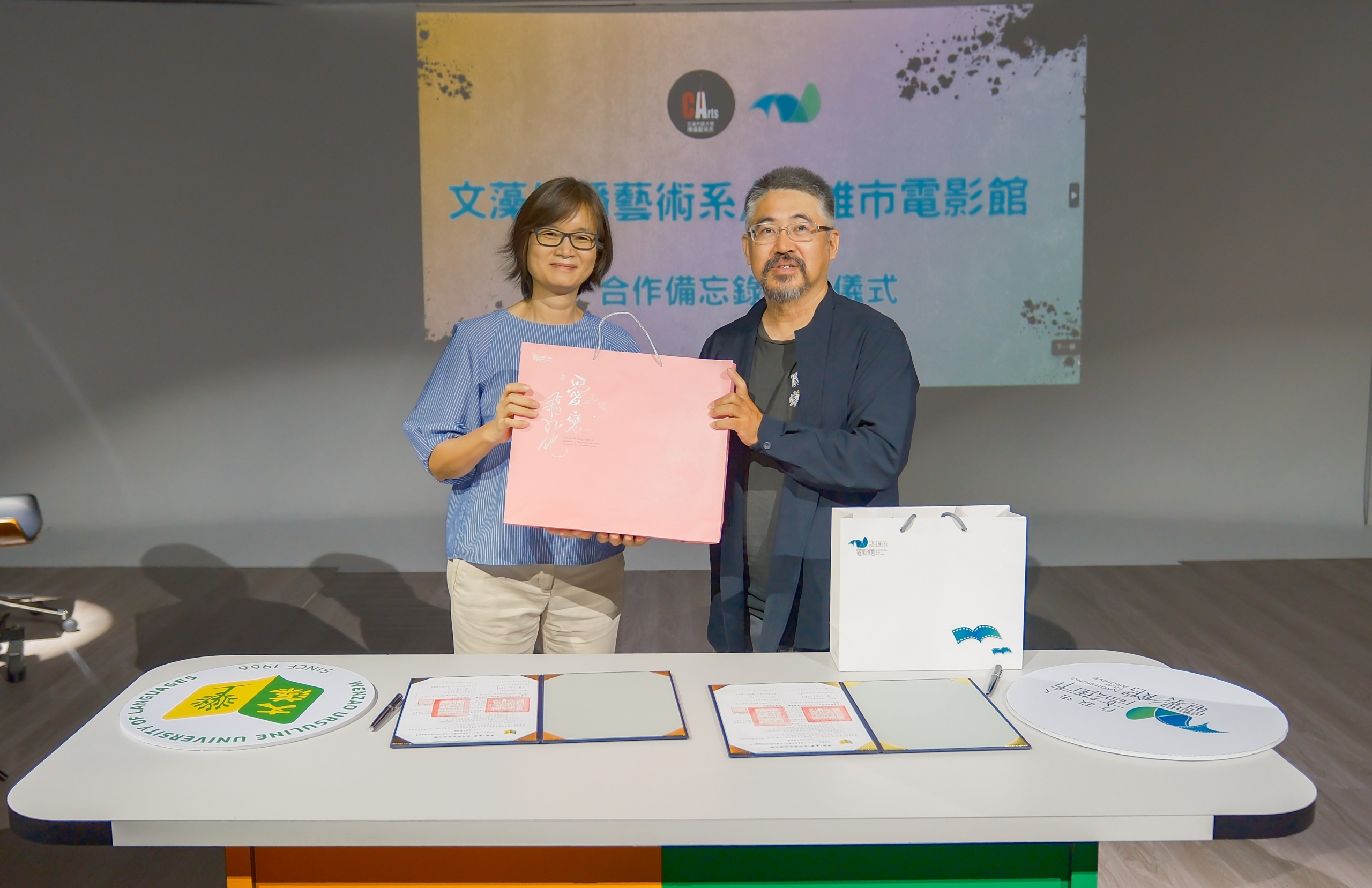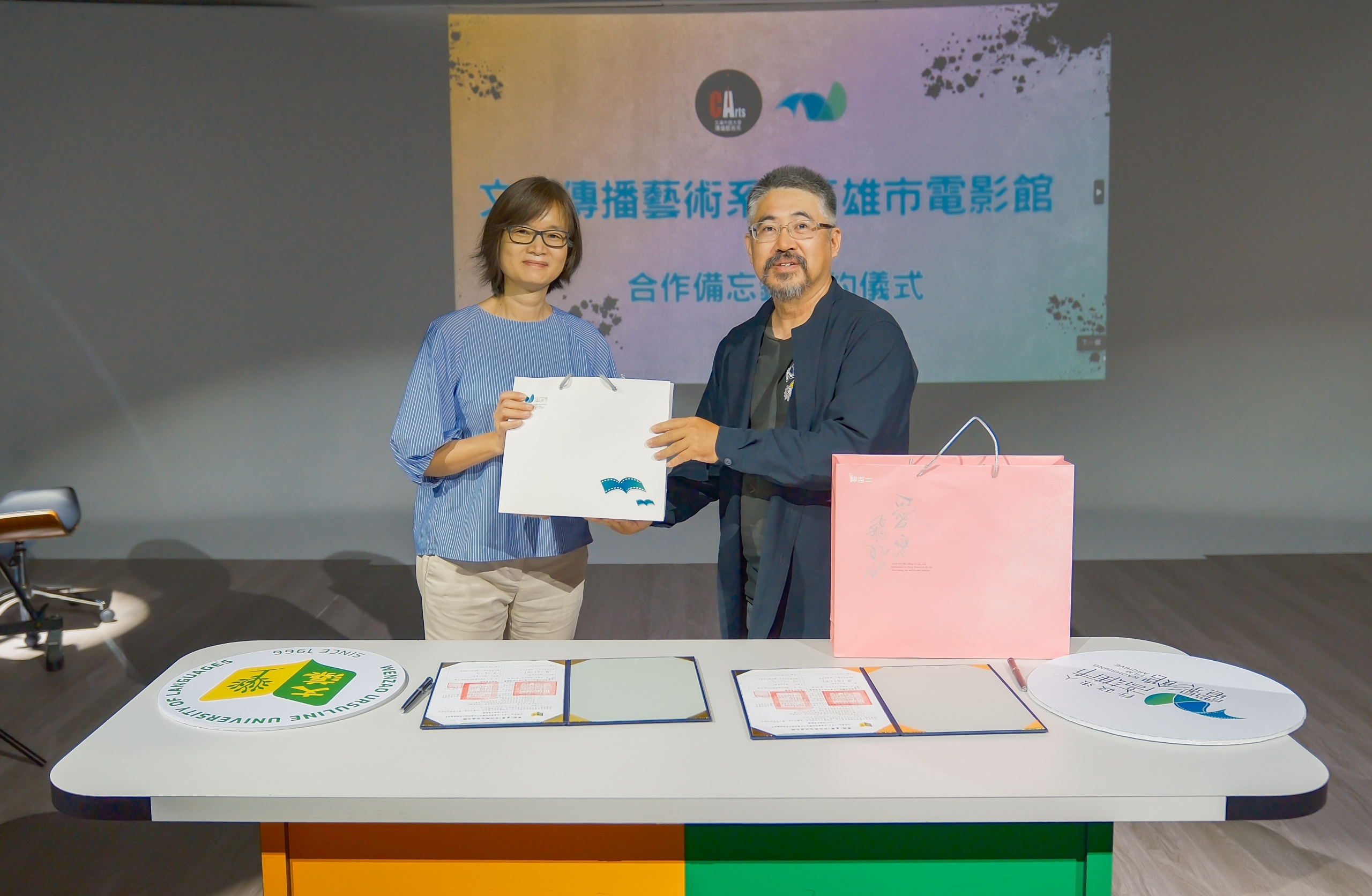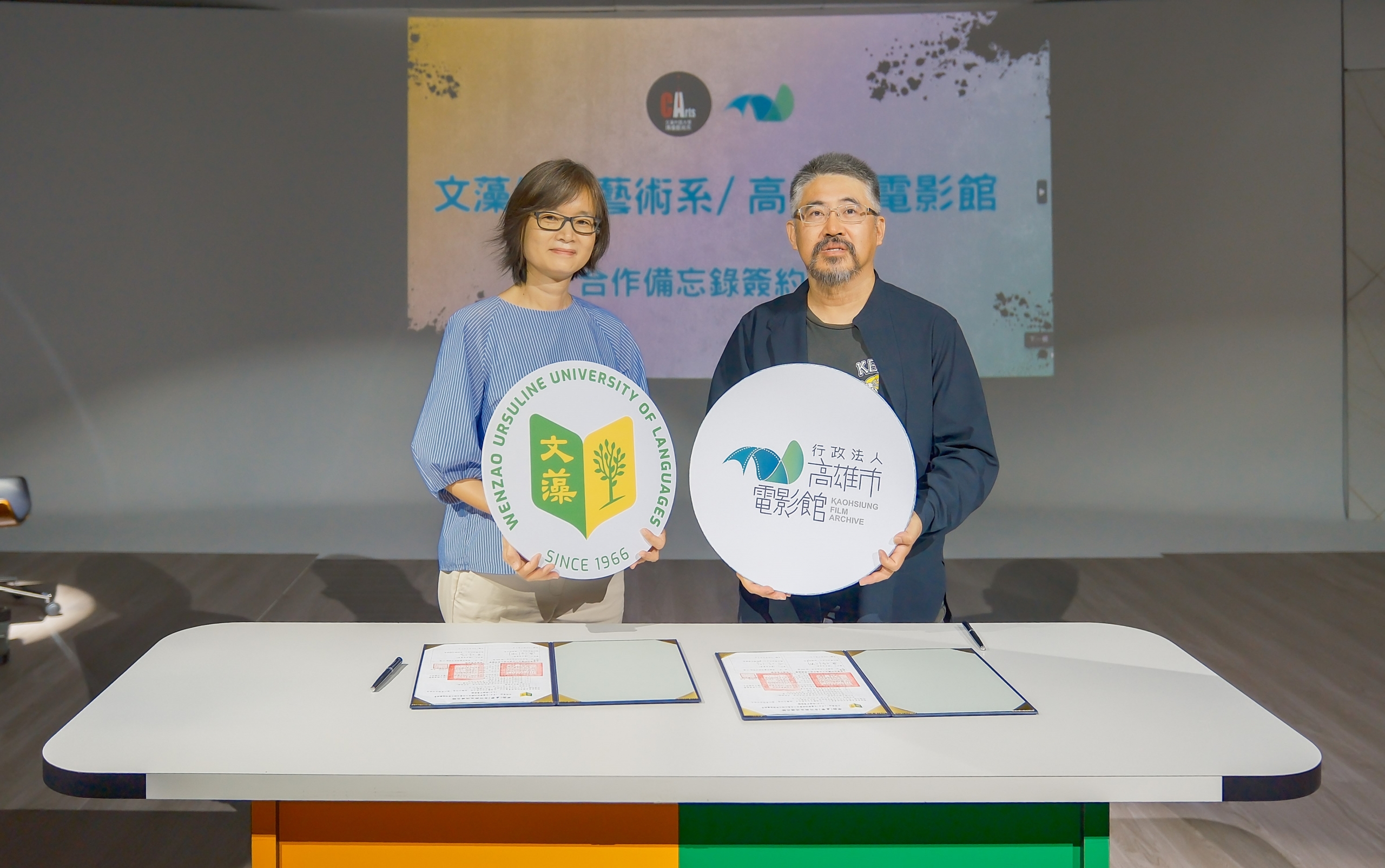 文藻外語大學傳播藝術系攜手高雄市電影館,締約共育影視專業人才,連俐俐主任(左)及黃皓傑代理館長(右)於締約後合影。相片攝影/公關室