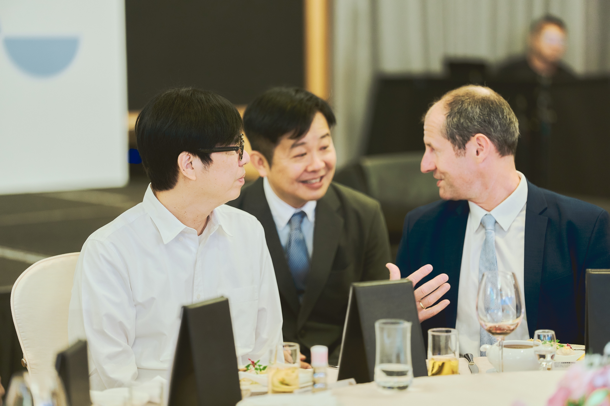 翻譯系黃育文老師(中)擔任晚宴口譯,圖左為高雄市陳其邁市長、圖右為歐洲經貿辦事處谷力哲處長。 |
