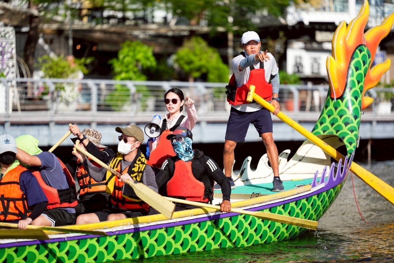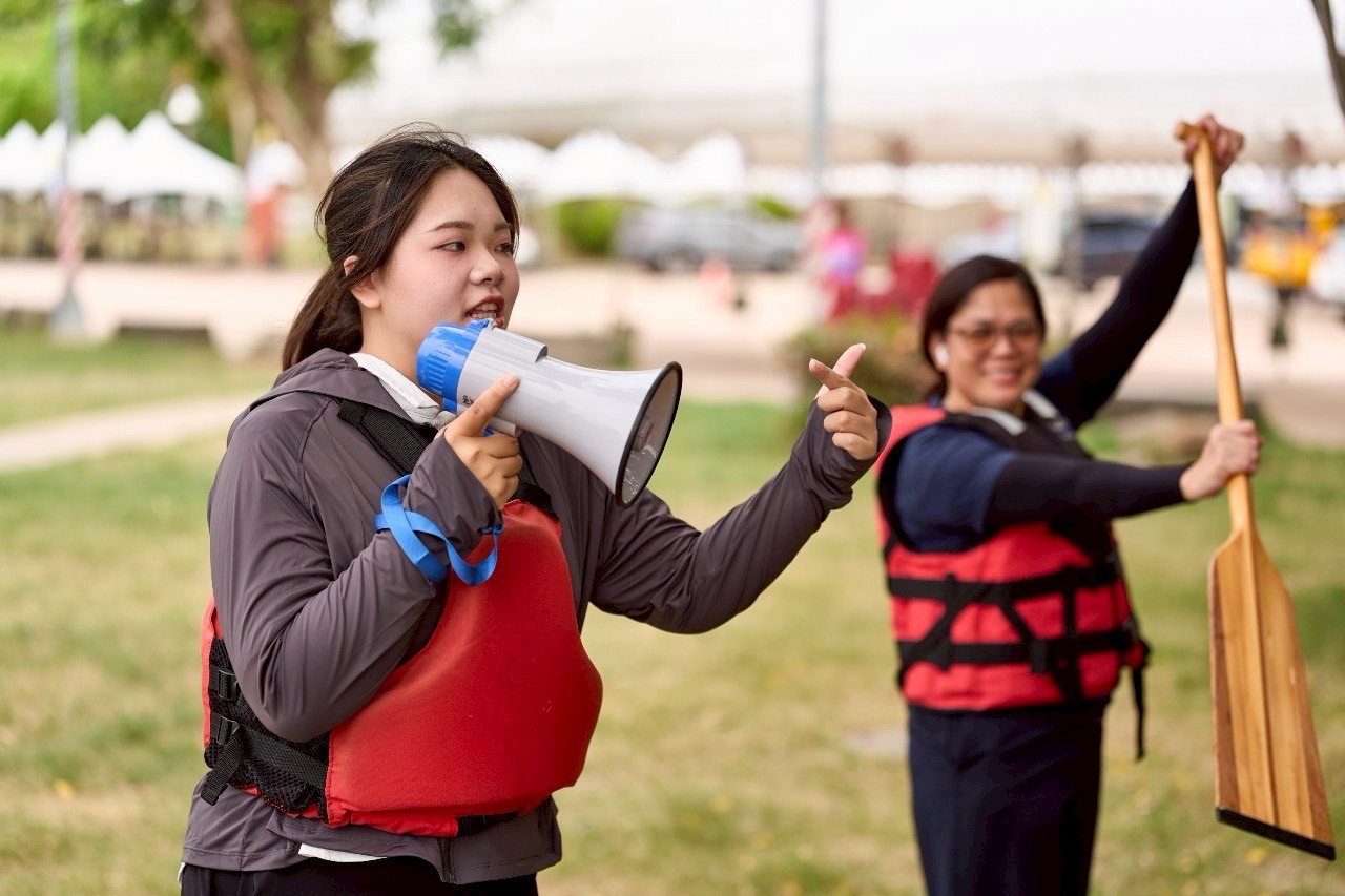 翻譯系學生劉芷寧(左)協助菲律賓在台辦事處龍舟競賽賽前練習 |