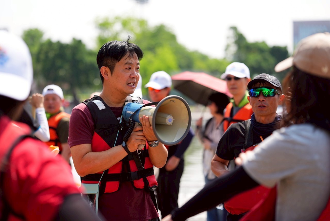 翻譯系黃育文老師(中)協助龍舟賽口譯 |