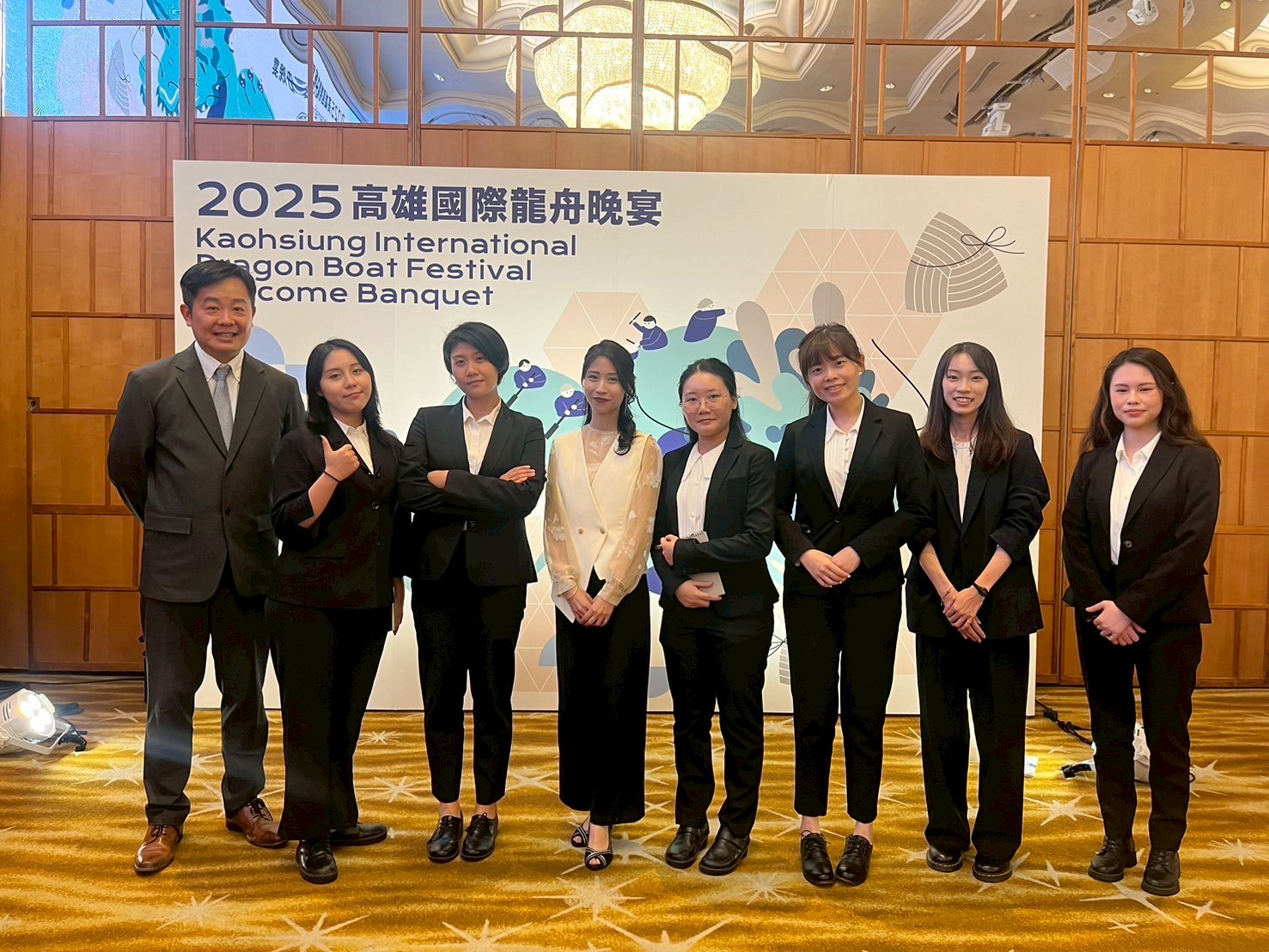 翻譯系師生協助2025高雄國際龍舟晚宴擔任口譯,圖由左至右依序為黃育文老師、碩士班學生李謦芳、孫筱媛、藍文婷老師、碩士班學生鄭慈恩、蔡宛庭、陳美優、大學部學生徐韻淳。 |