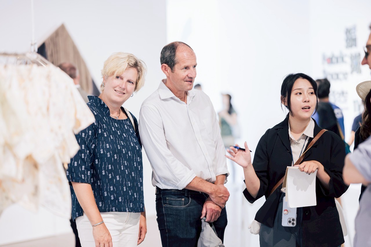 翻譯系碩士班學生李謦芳(右)協助高雄內惟藝術中心導覽口譯,圖中為歐洲經貿辦事處谷力哲處長。 |