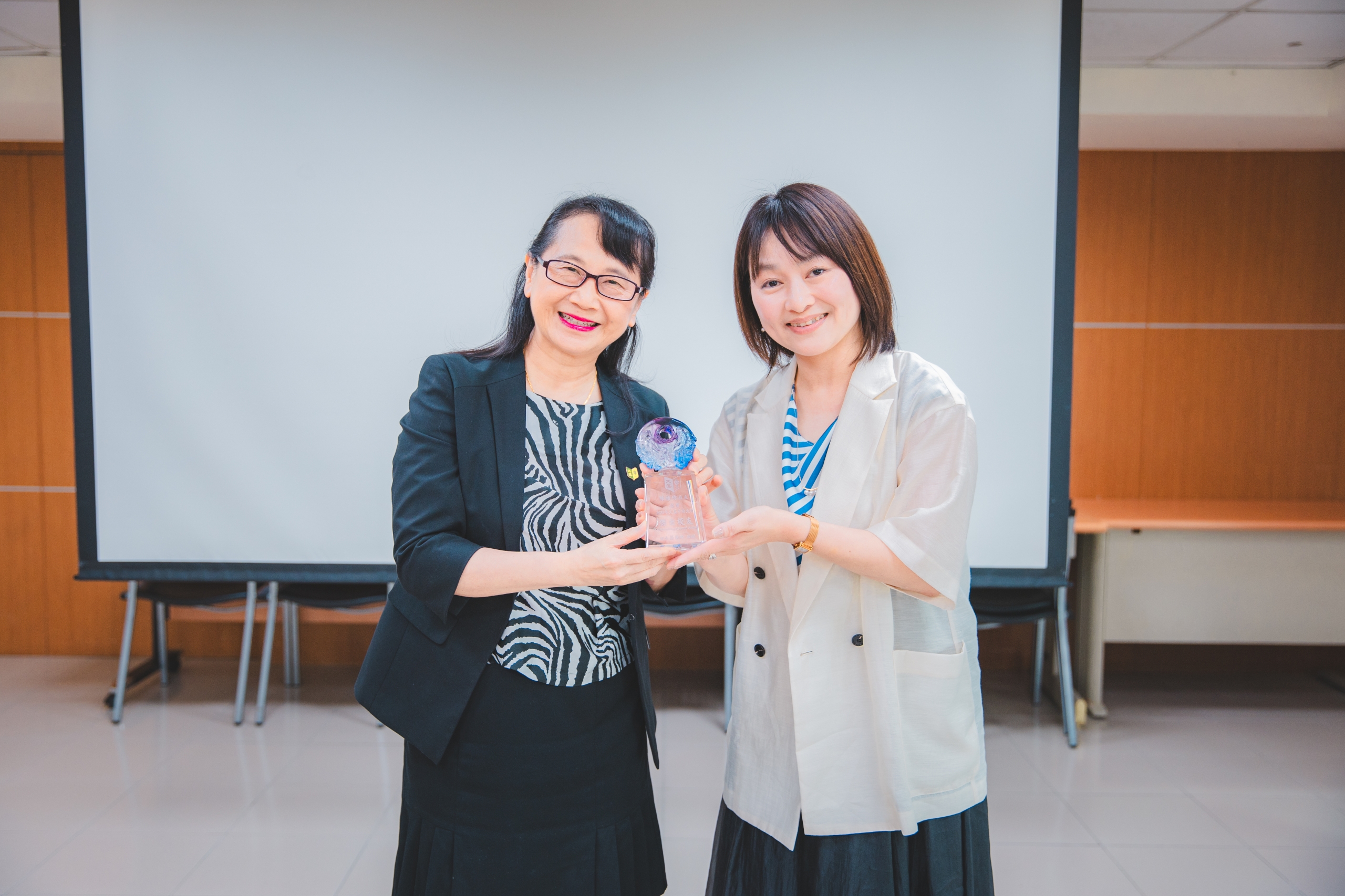 莊慧玲校長(左)頒發2025年傑出校友獎座予陳怡伶校友(右) |