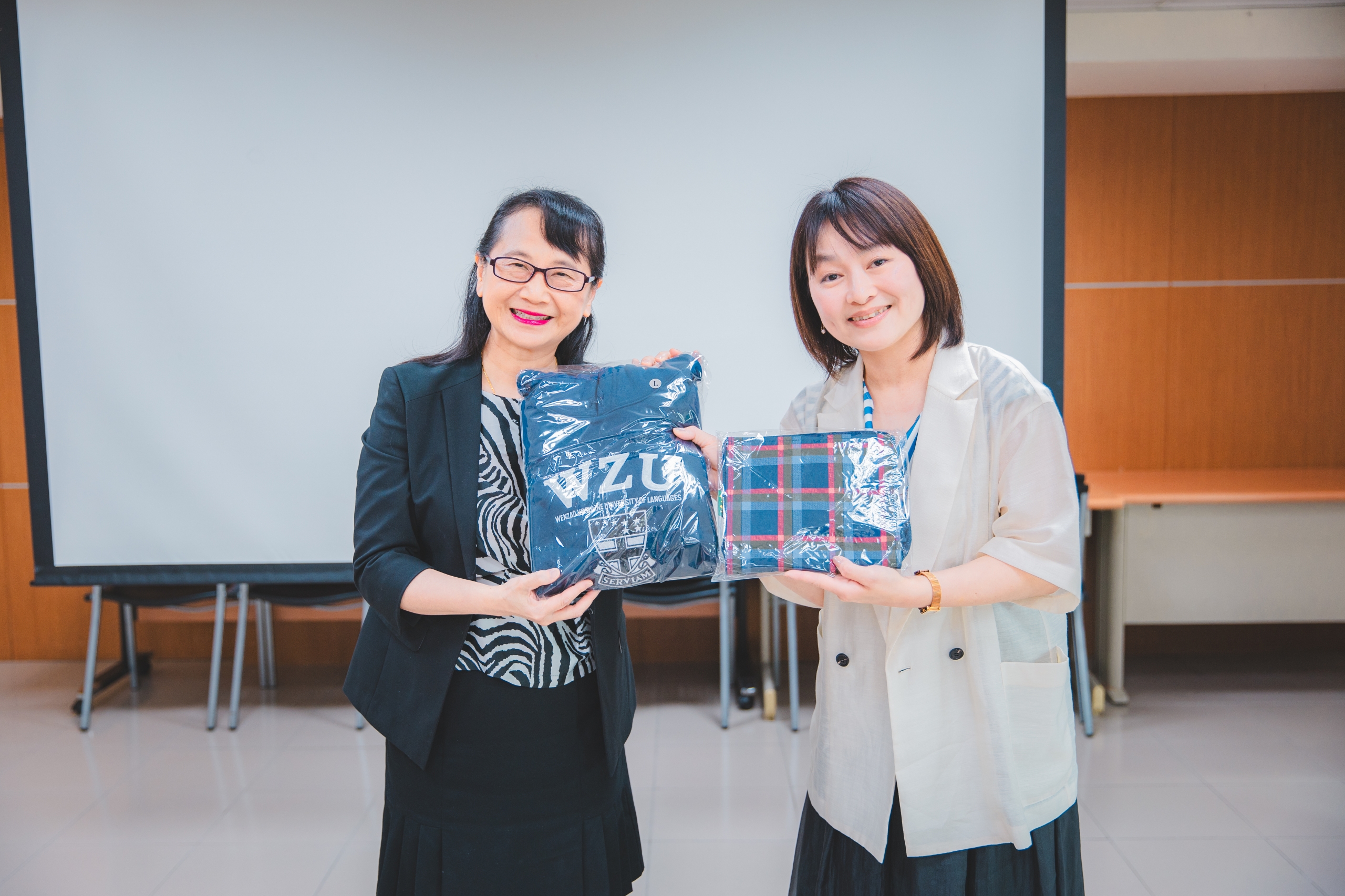 莊慧玲校長(左)致贈陳怡伶校友(右),文藻紀念帽T及花格紋小書包。 |