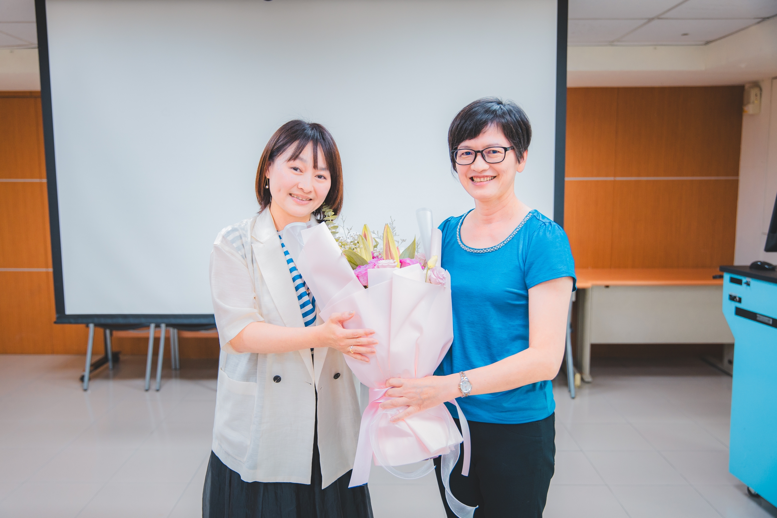 日本語文系陳淑瑩主任(右)致贈花束予陳怡伶校友(左) |