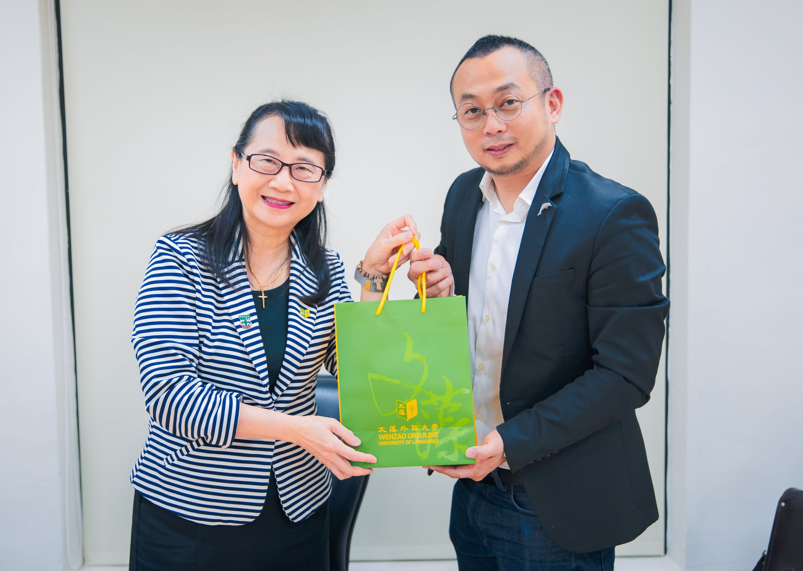 文藻外大莊慧玲校長(左)致贈簽約紀念品予智食良果吳昱鋒執行長 |