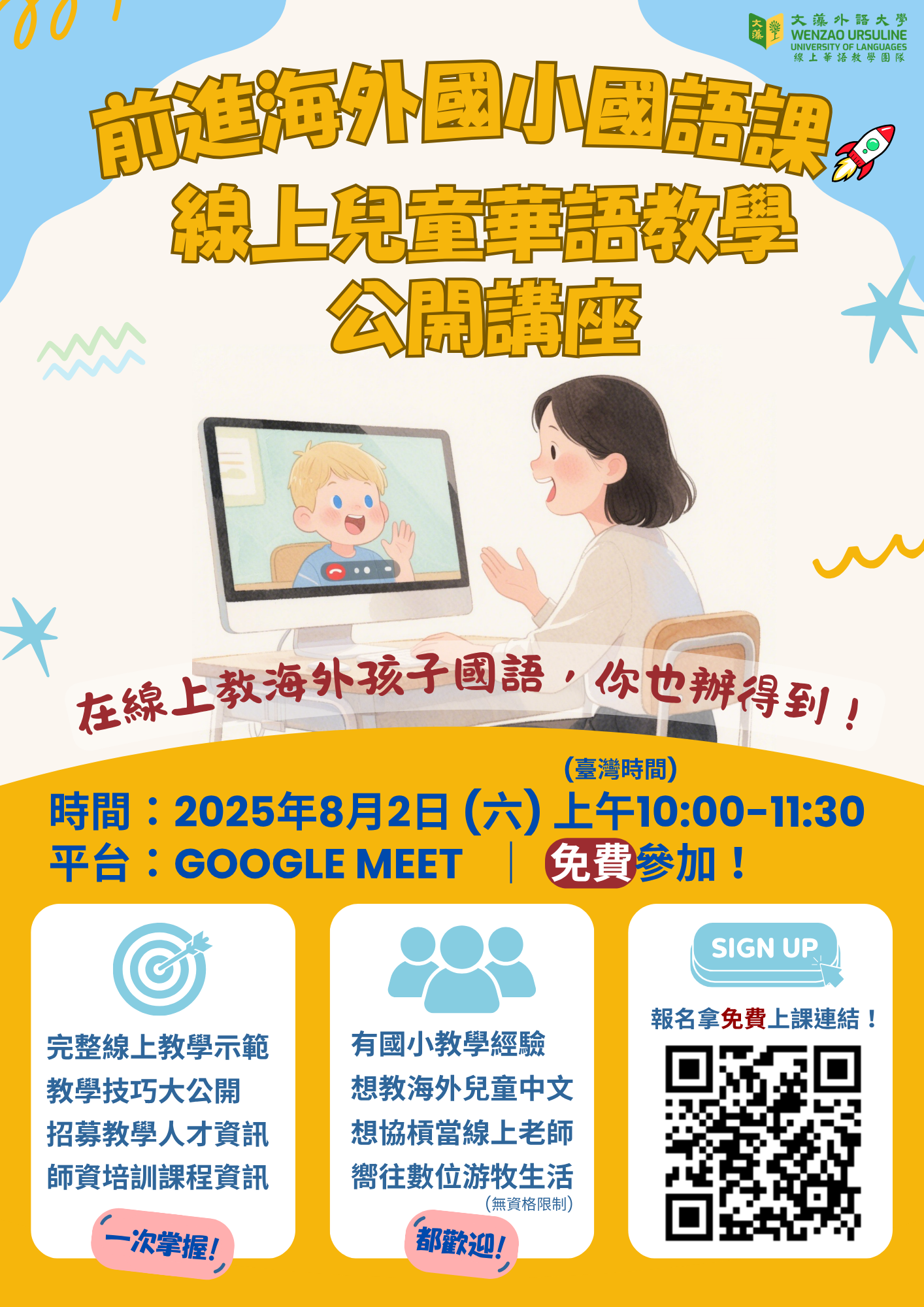 為因應線上兒童華語文教學需求持續成長,並拓展具兒童教學熱忱之線上師資人力,我們特別舉辦「線上兒童華語教學公開講座」,邀請資深講師示範實際教學流程,並說明課程設計理念與授課要點。另外,於講座中也將分享教師招募資訊,以及師資培訓課程資訊!