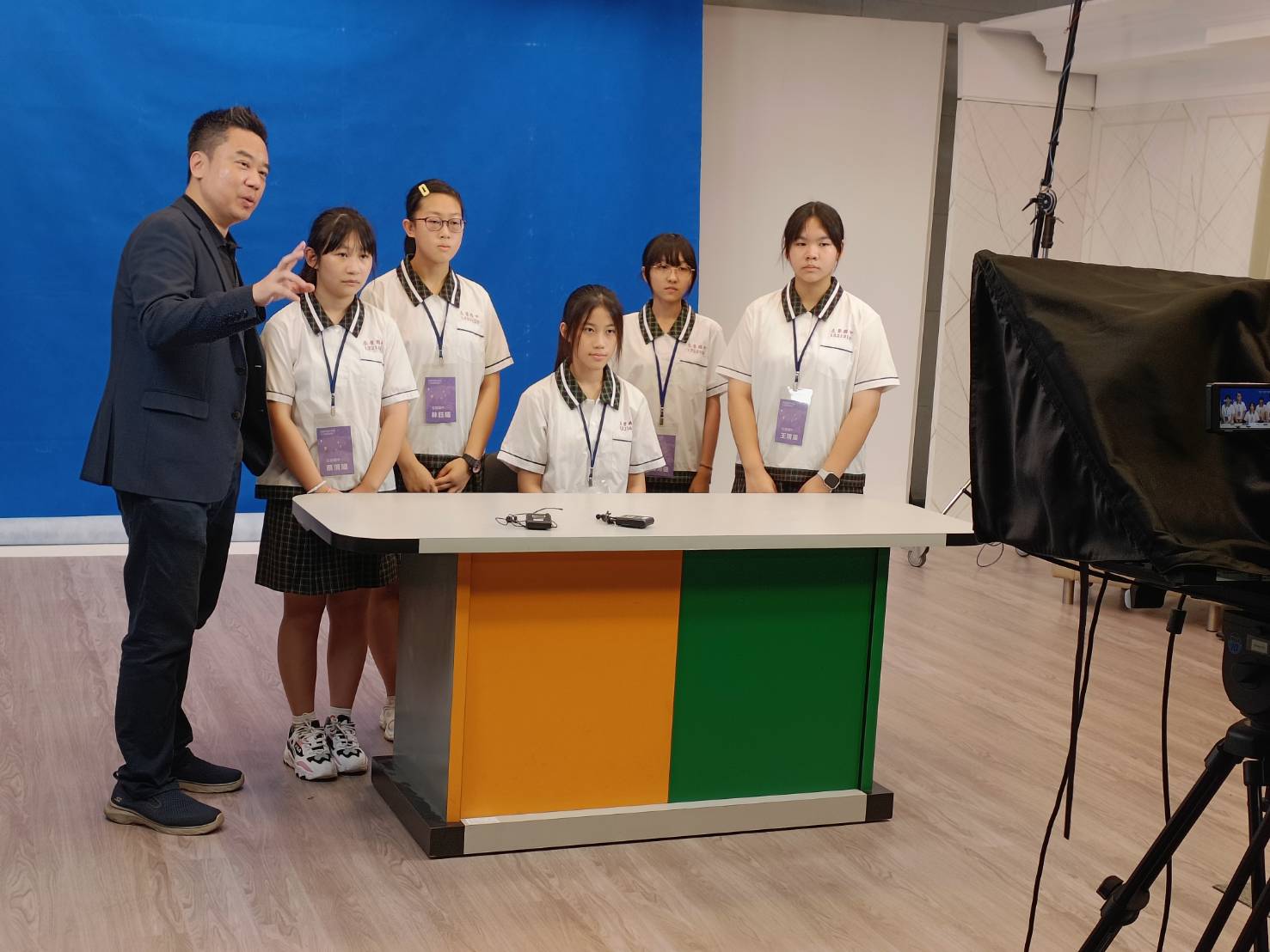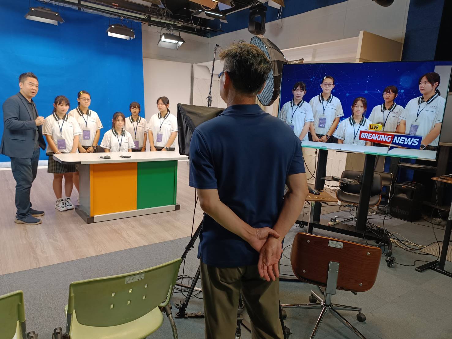 學會英語播報的基本功後,林裕展帶領學生到文藻傳播藝術系的專業攝影棚,深入了解電視新聞製播流程,並讓學生看著讀稿機,一一上臺播報英語新聞,內容包括教育部公布集中管理學生手機的新措施,還有最新發明的AI洗機車機器等。