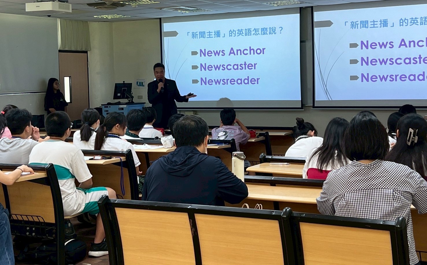 活動一開始,林裕展先介紹英語主播必備的能力,包括英語發音、單字用法、文法能力、播報儀態等,並透過幕後花絮片段,讓學生了解主播一天的工作流程。