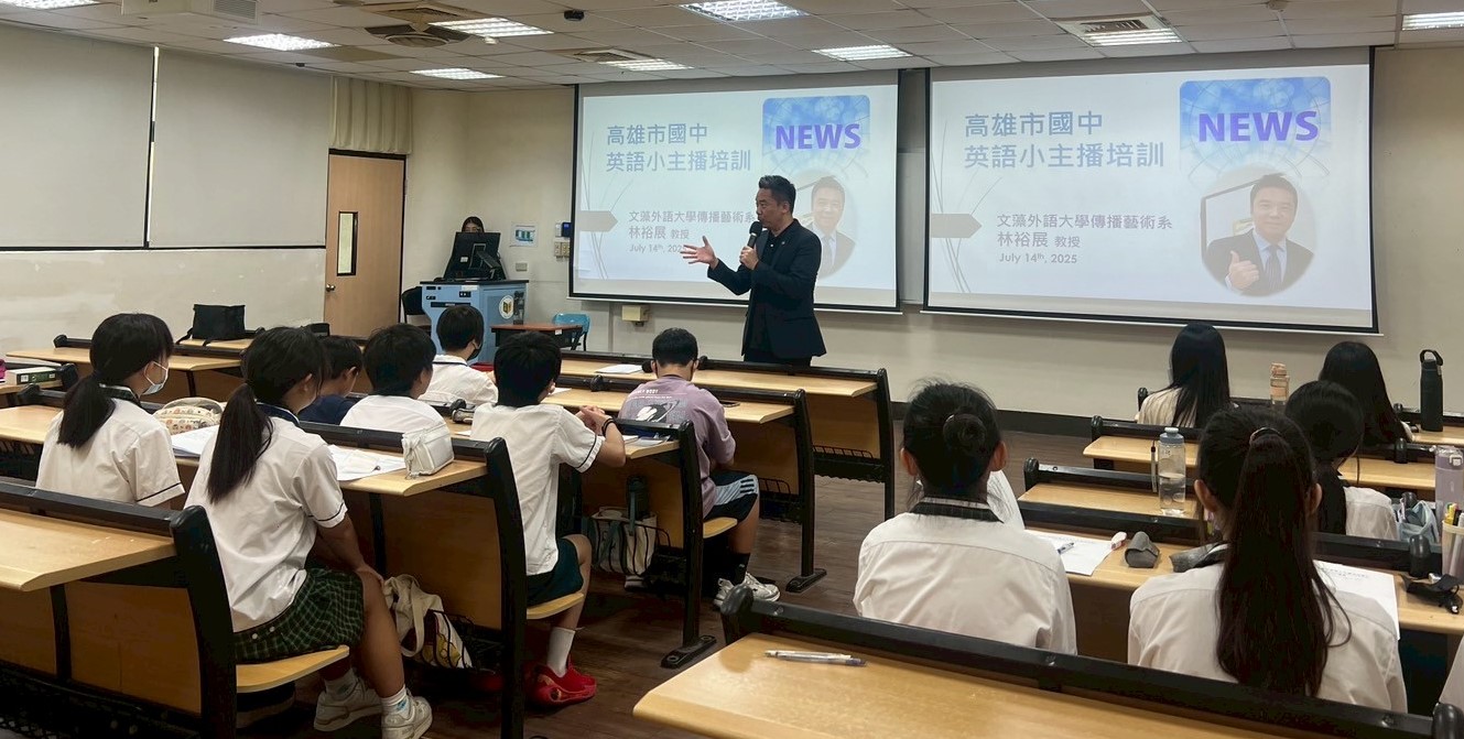【國語日報記者陳景清/高雄報導】國語日報社與文藻外語大學傳播藝術系合作,昨天共同舉辦「高雄市國中英語小主播培訓營」,邀請曾任電視臺英語新聞主播、現任文藻傳藝系助理教授林裕展擔任講師,指導學生播報英語新聞。二十餘名學生前進文藻攝影棚,實況播報新聞,一個個在臺上架式十足。