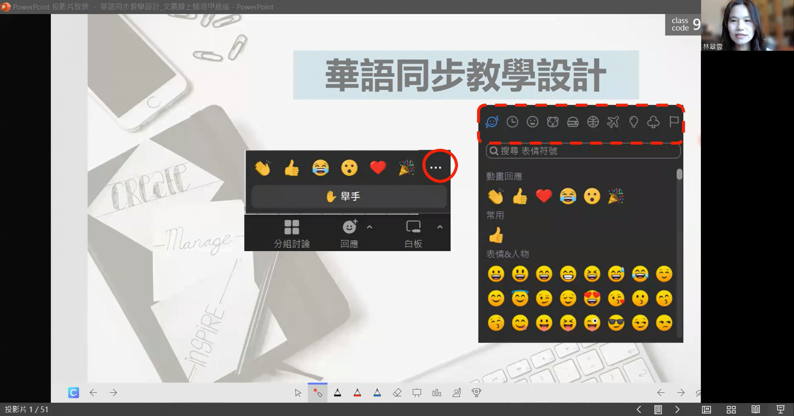 由林翠雲主任教授的「線上華語團體班教學實務師資培訓課程(甲級)」〈同步教學與教學設計(認證導向)〉上課畫面 |