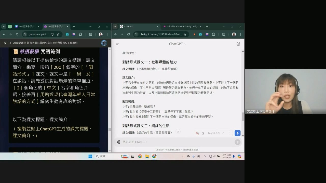 由陳嬿汝老師教授的「微型師資培訓─AI主題實務系列課程」〈語言老師必備的AI指令技巧與教育AI工具應用〉上課畫面 |