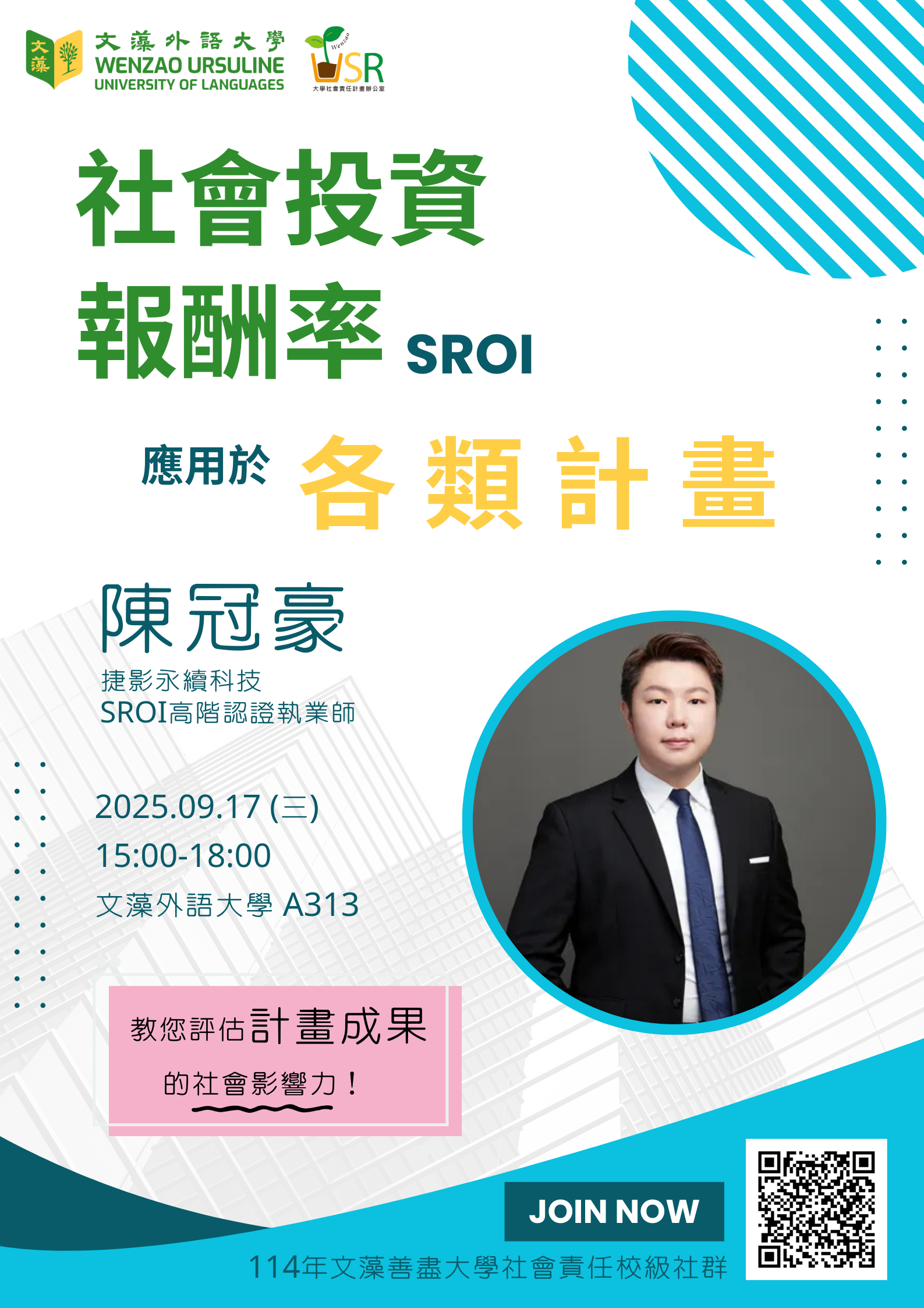 本場講座不僅聚焦於大學社會責任(USR),更適用於各類型計畫,無論是教育推廣、社會服務、企業專案或非營利方案,都能透過 SROI 方法,量化成果、提升說服力與影響力。