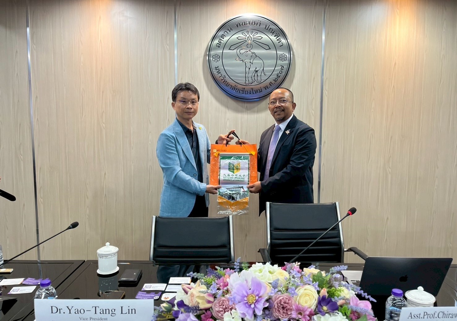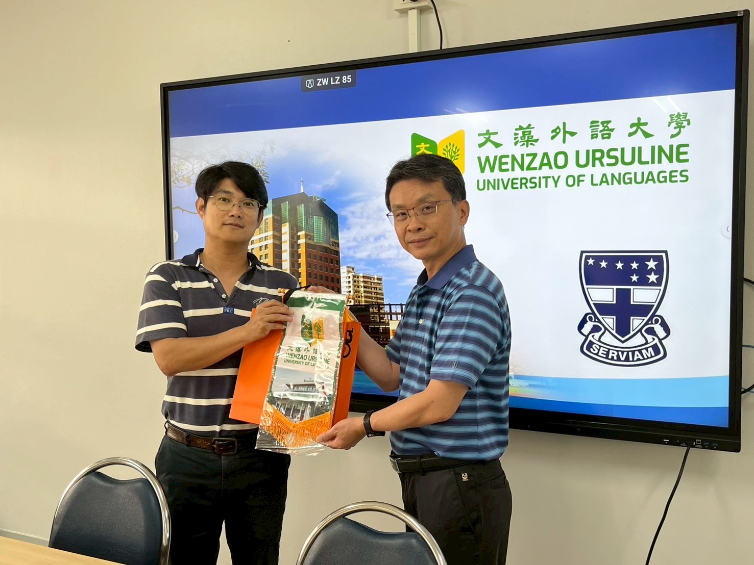 林耀堂副校長(左)致贈文藻校旗予清邁大學校長特助(右) |