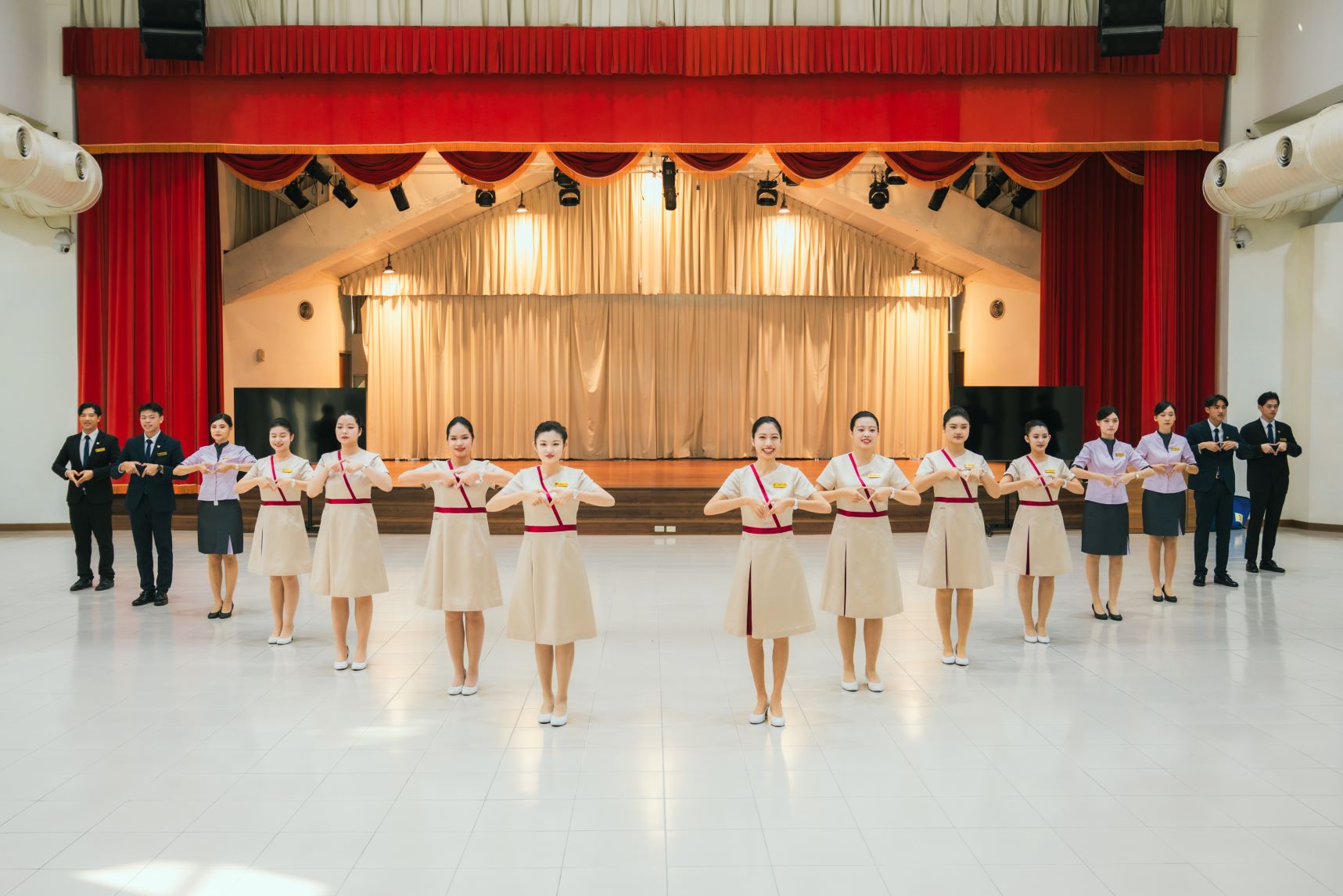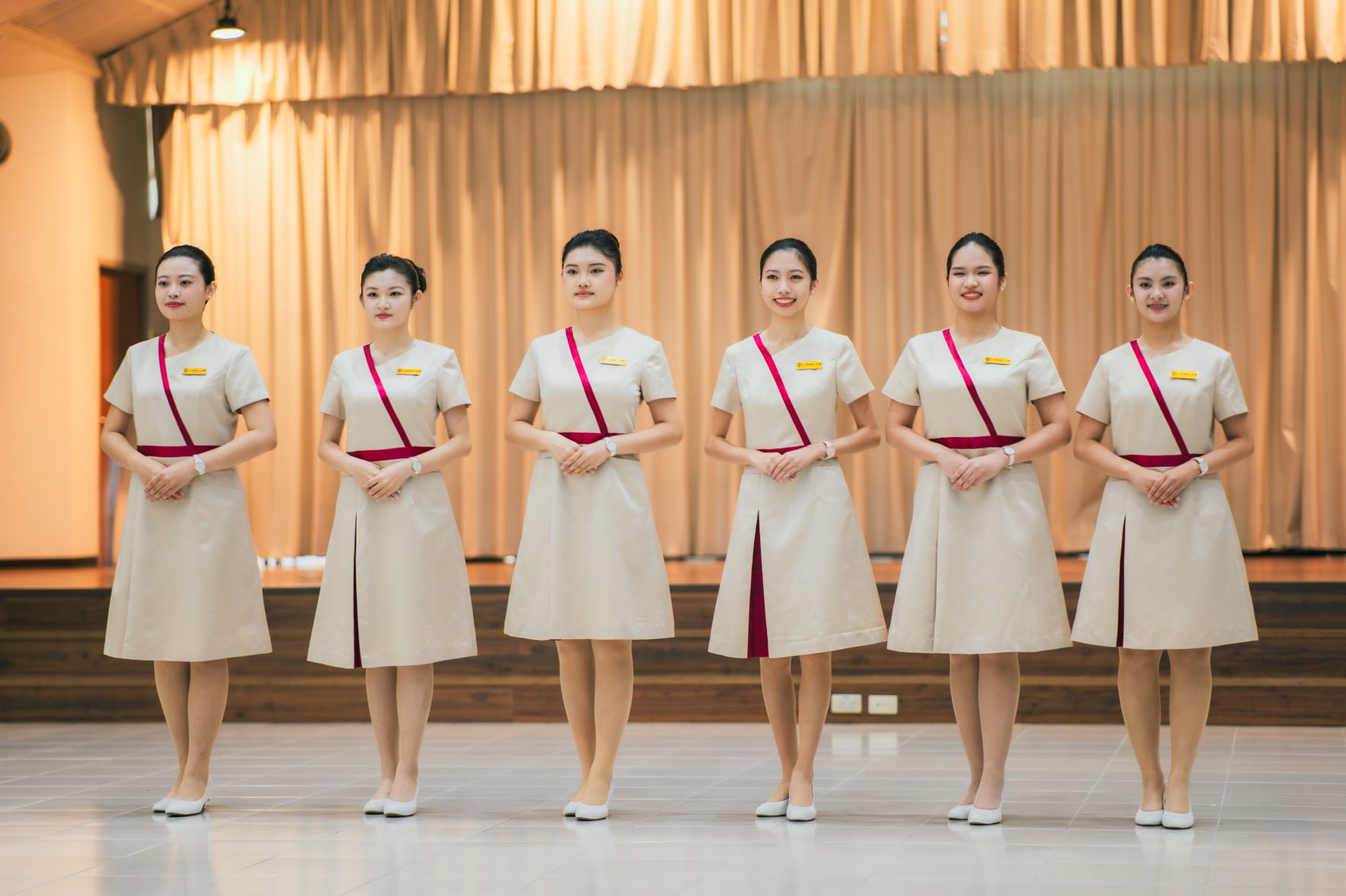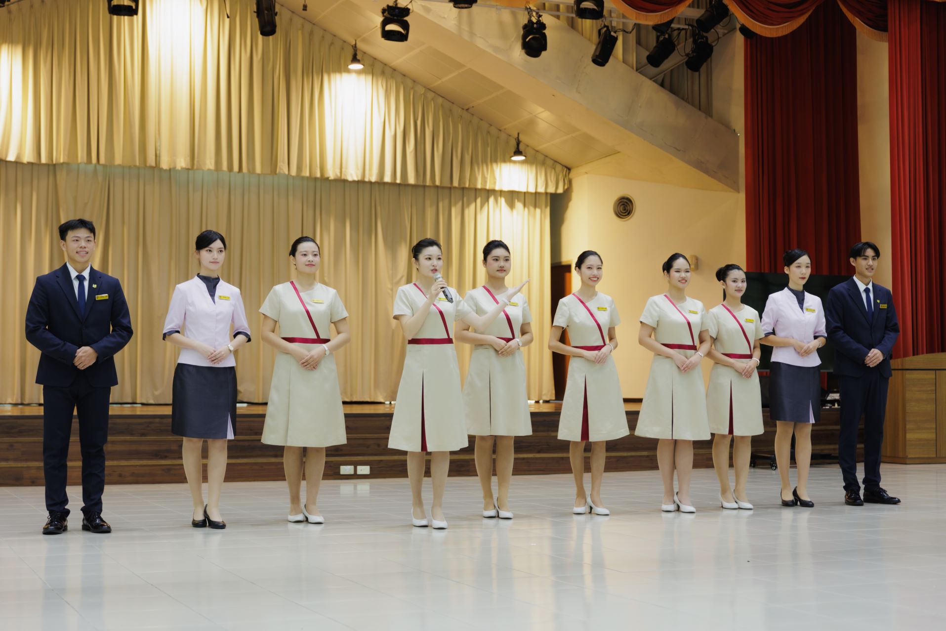 為執行國慶接待任務,文藻外大特別訂製全新的禮賓服飾,服裝整體色澤以香檳金為主,展現高貴典雅的氣質,而紅色絲帶則象徵熱情,將南台灣高雄特有的人情味表露無遺。 |