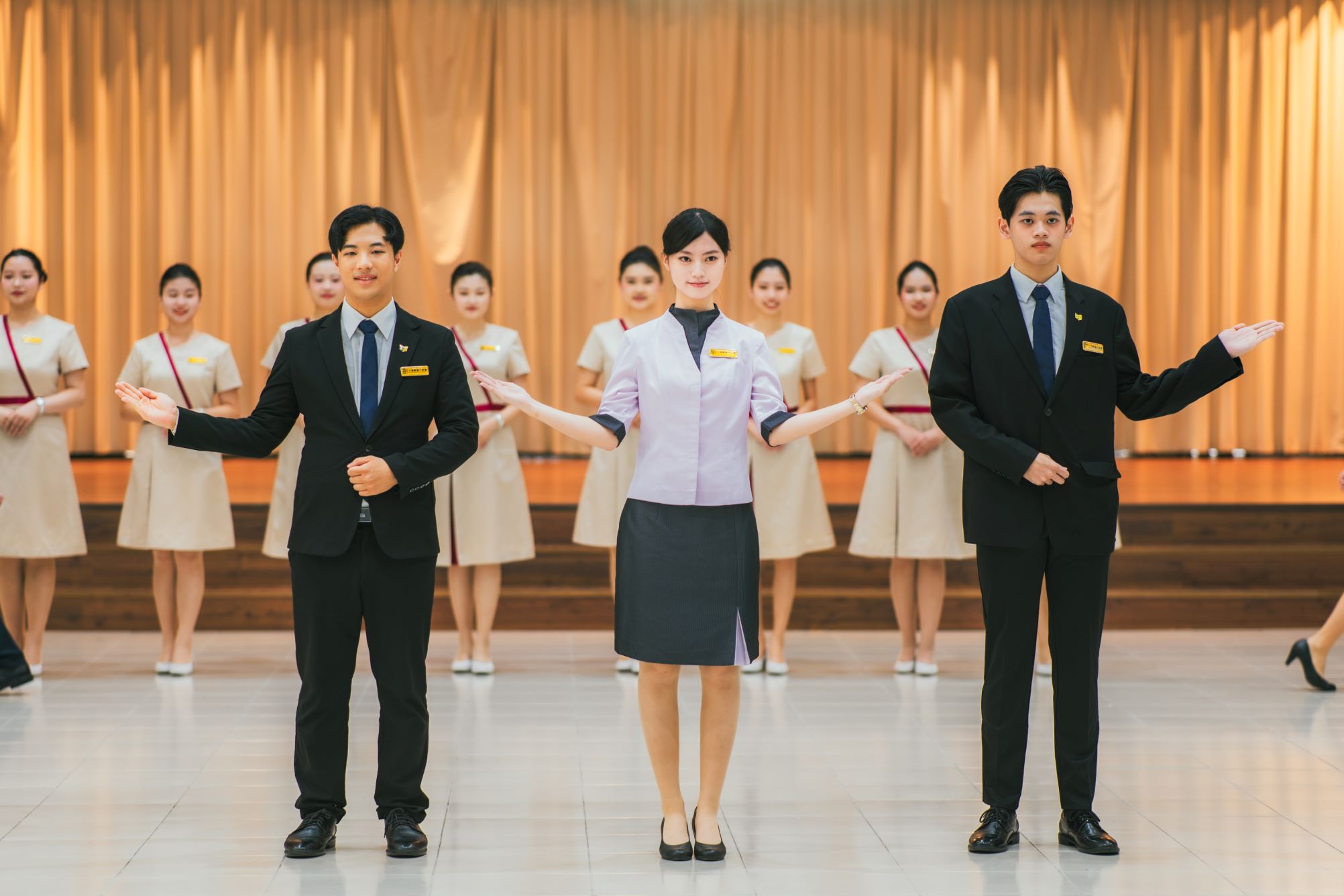 文藻外大此次入選的學生皆為公關室親善大使團團員,除了具備國語、台語、客語能力外,也精通英語、法語、德語、西班牙語、日語、韓語及越南語等多國語言,能靈活應對國際賓客的不同外語需求。為執行國慶接待任務,校方特別訂製全新的禮賓服飾,服裝整體色澤以香檳金為主,展現高貴典雅的氣質,而紅色絲帶則象徵熱情,將南台灣高雄特有的人情味表露無遺。文藻親善大使自今年6月起展開密集培訓,課程涵蓋儀態形象、專業禮賓及基本救命術(BLS)證照訓練,他們更額外勤練手語,展現學生多元能力與服務的精神。