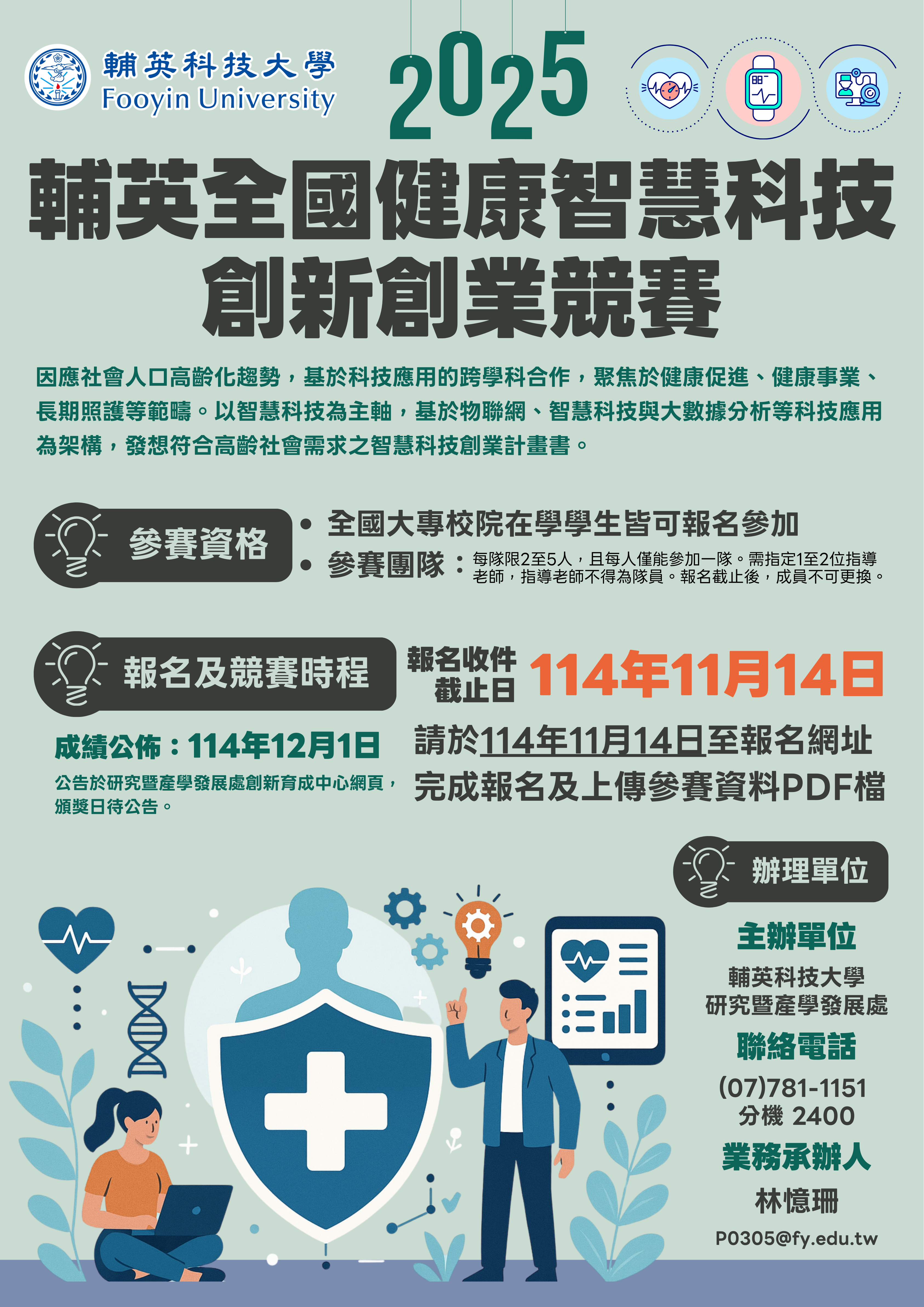【產官學組】【轉知】輔英科技大學主辦「2025輔英全國健康智慧科技創新創業競賽」,請查照。