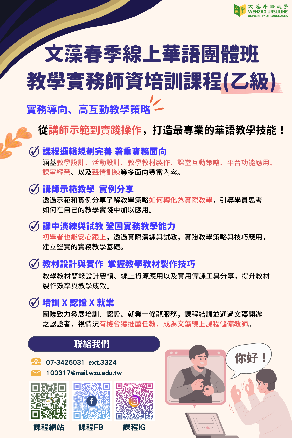 【文藻線上華語團體班教學實務師資培訓課程(乙級) 熱情招生中!】