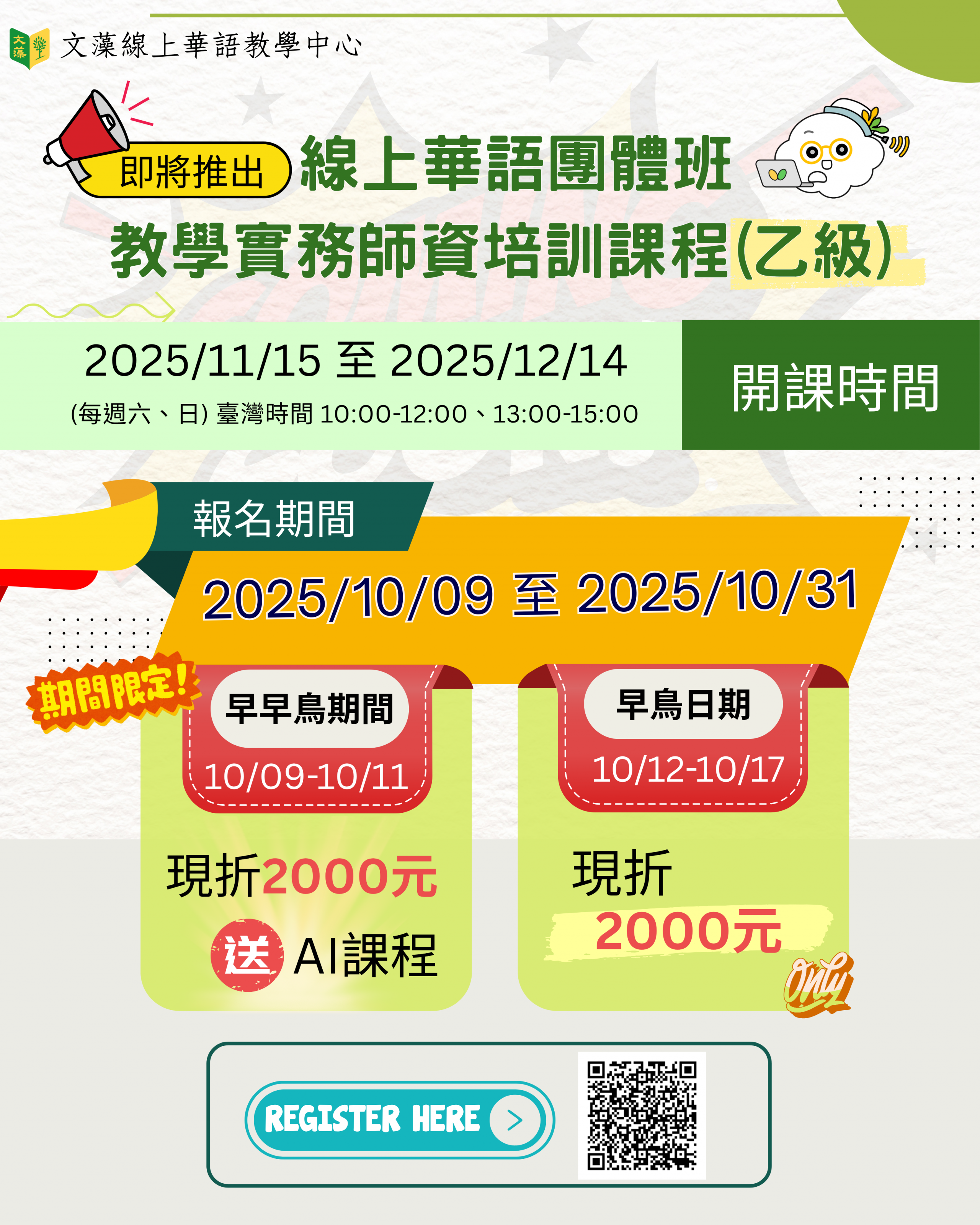 文藻線上華語團體班教學實務師資培訓課程(乙級) 熱情招生中!早鳥優惠現折2000元!