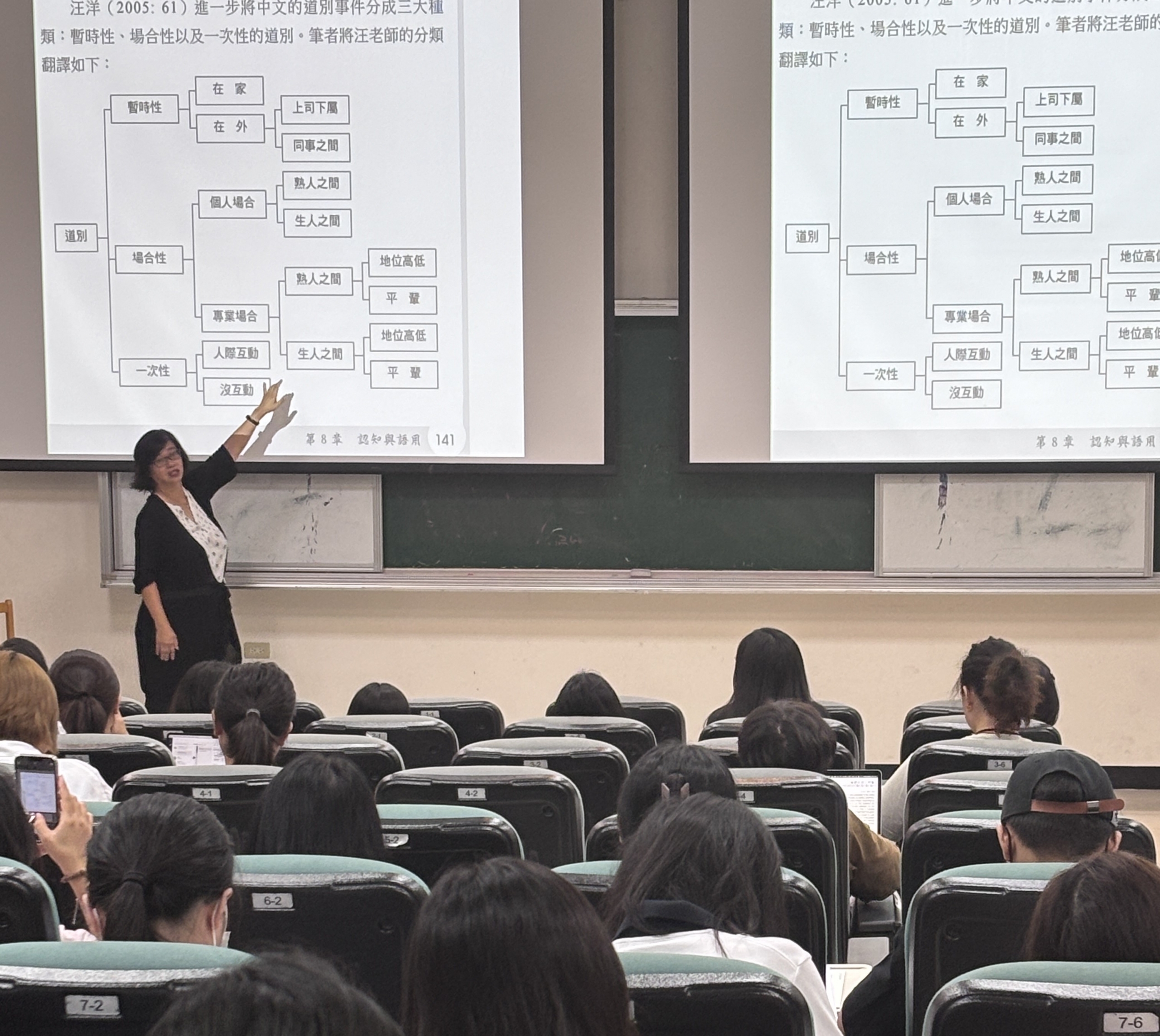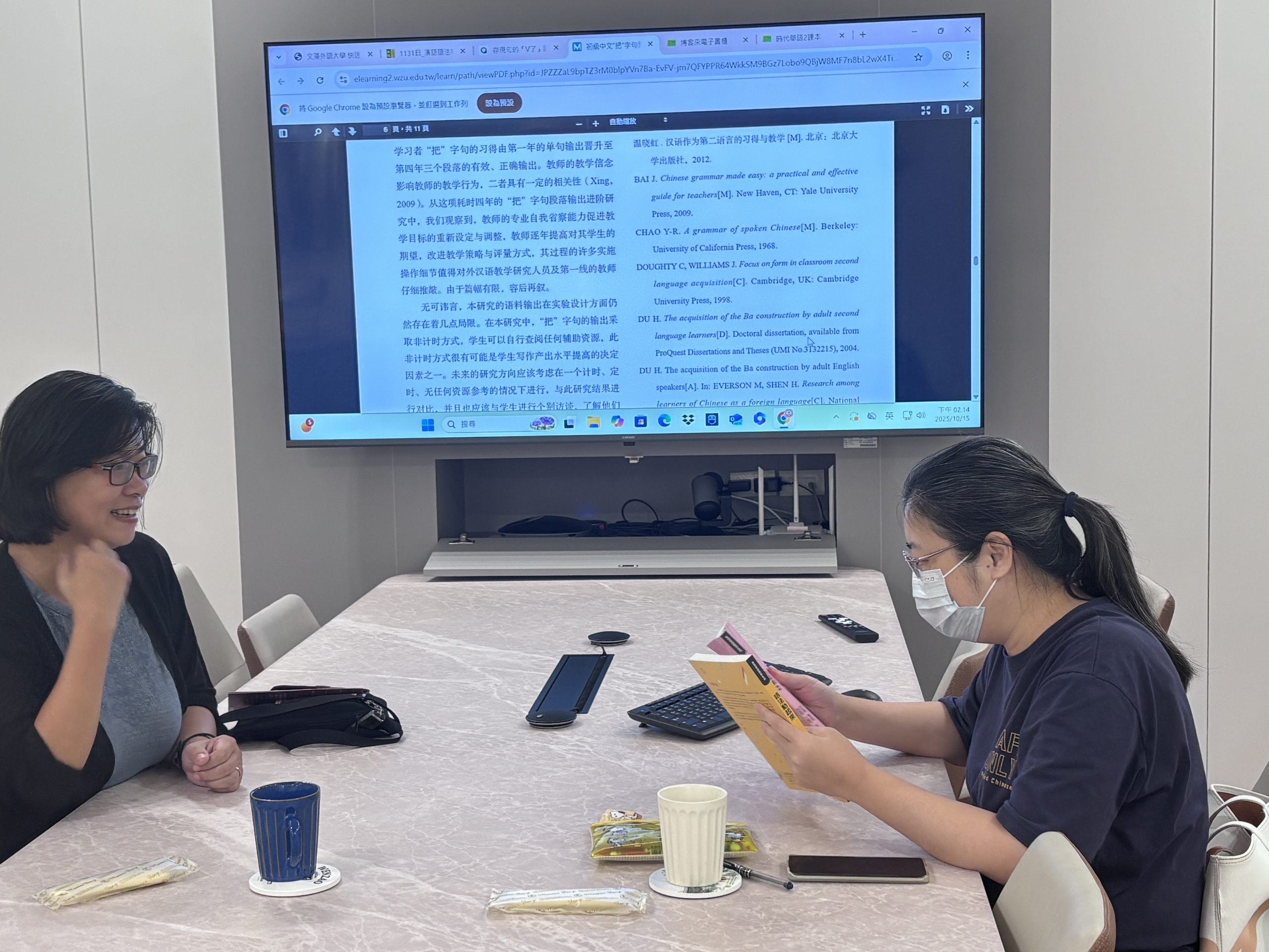 戴金惠教授(左)與應華系教師(右)就語法教學方法與引導策略進行深入交流,激盪出教學創新思維。 |