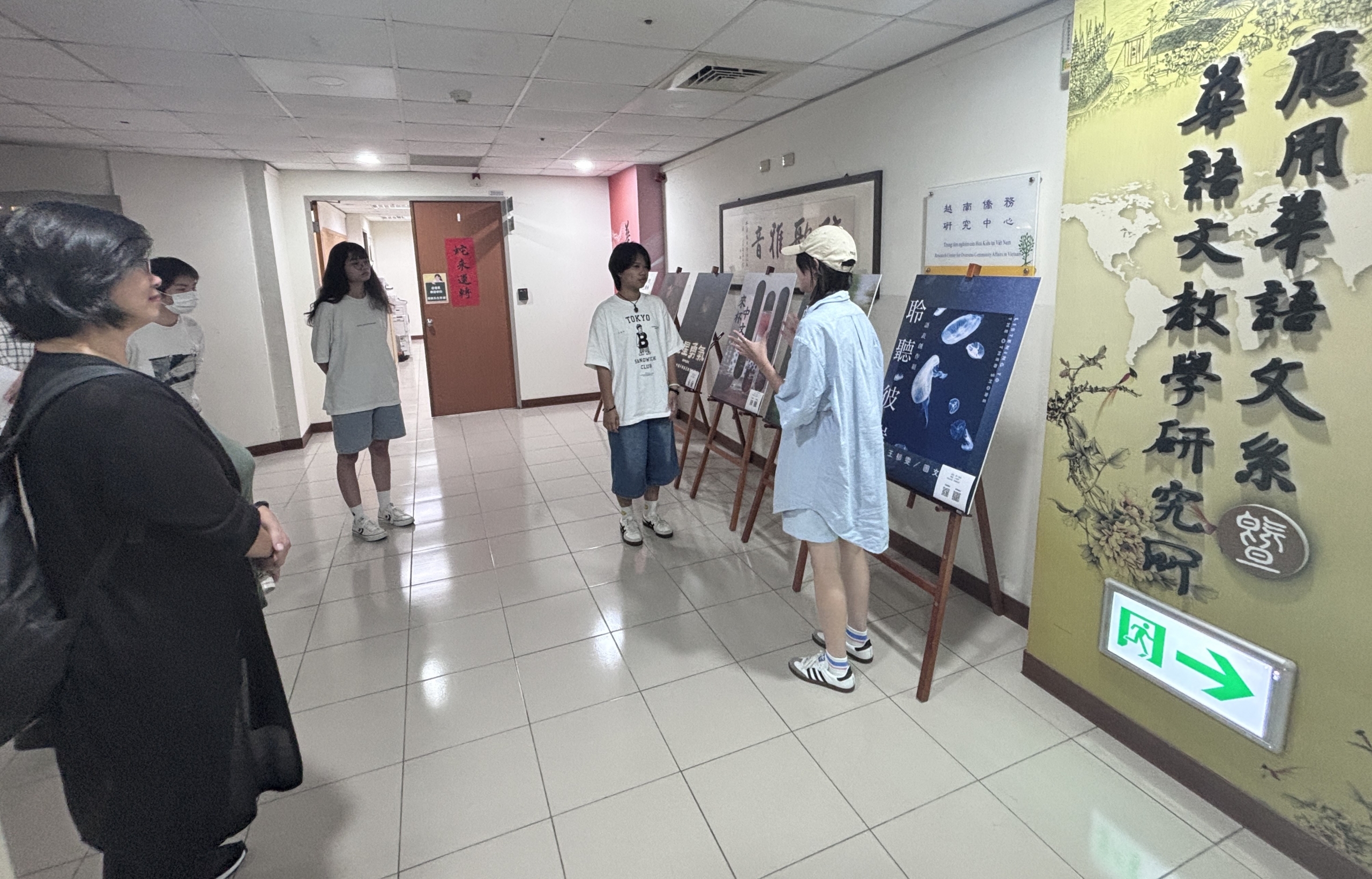 戴金惠教授(左一)參觀應華系「畢業專題封面大賞」,聆聽學生分享研究成果與創作理念。 |