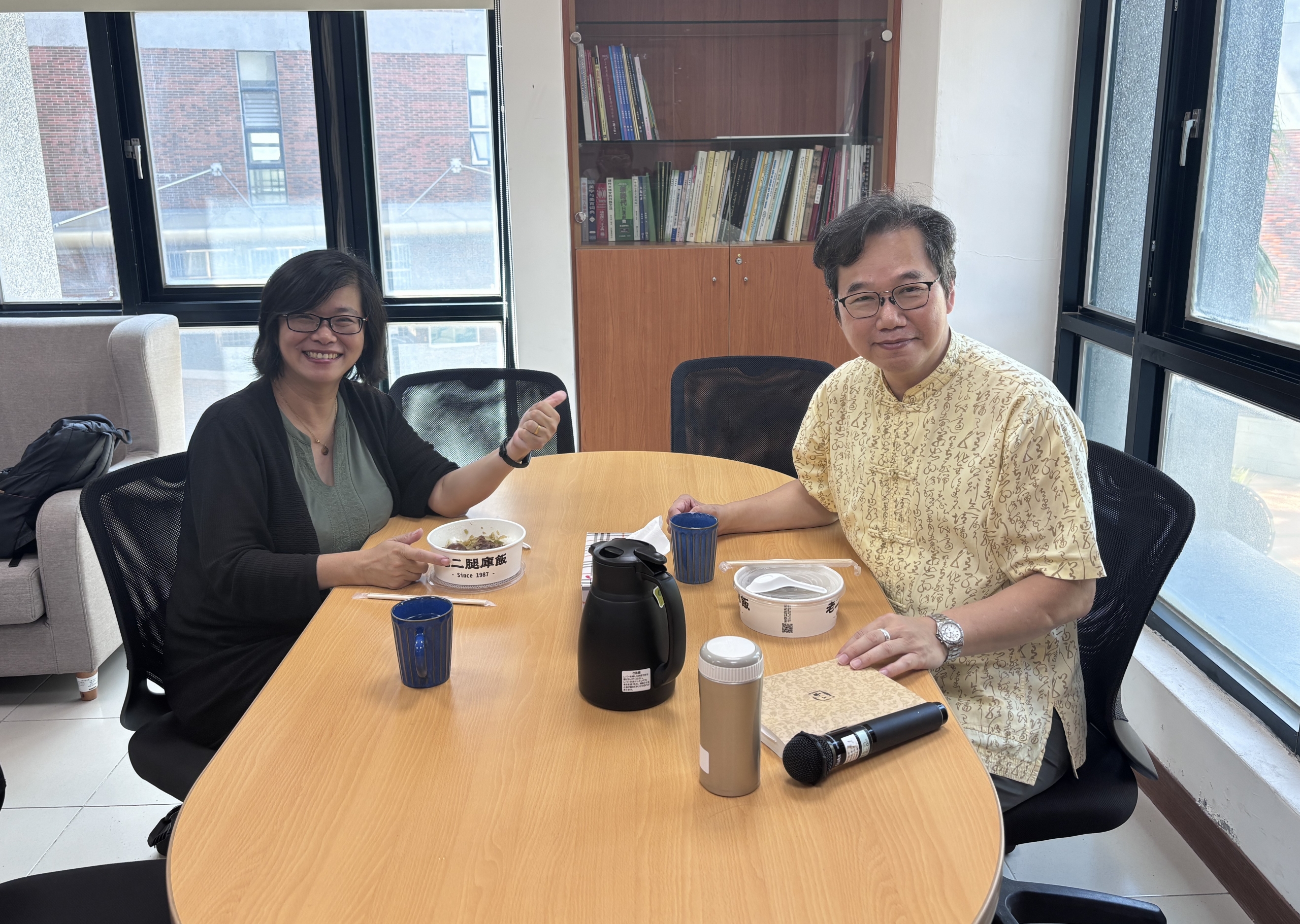 戴金惠教授(左)訪校期間拜會應華系卓福安主任(右),進行午餐交流,討論課程設計及未來合作的可能˙。 |