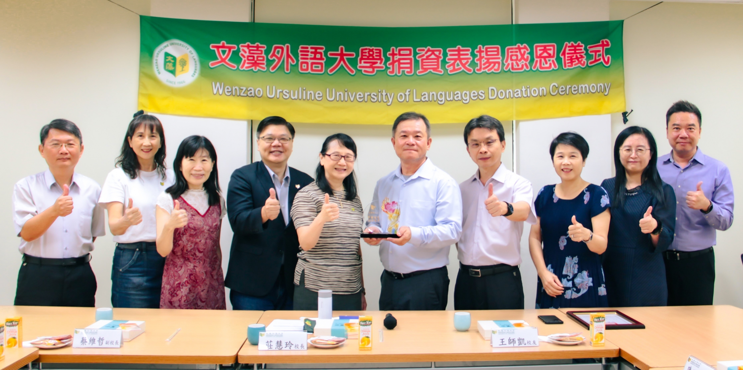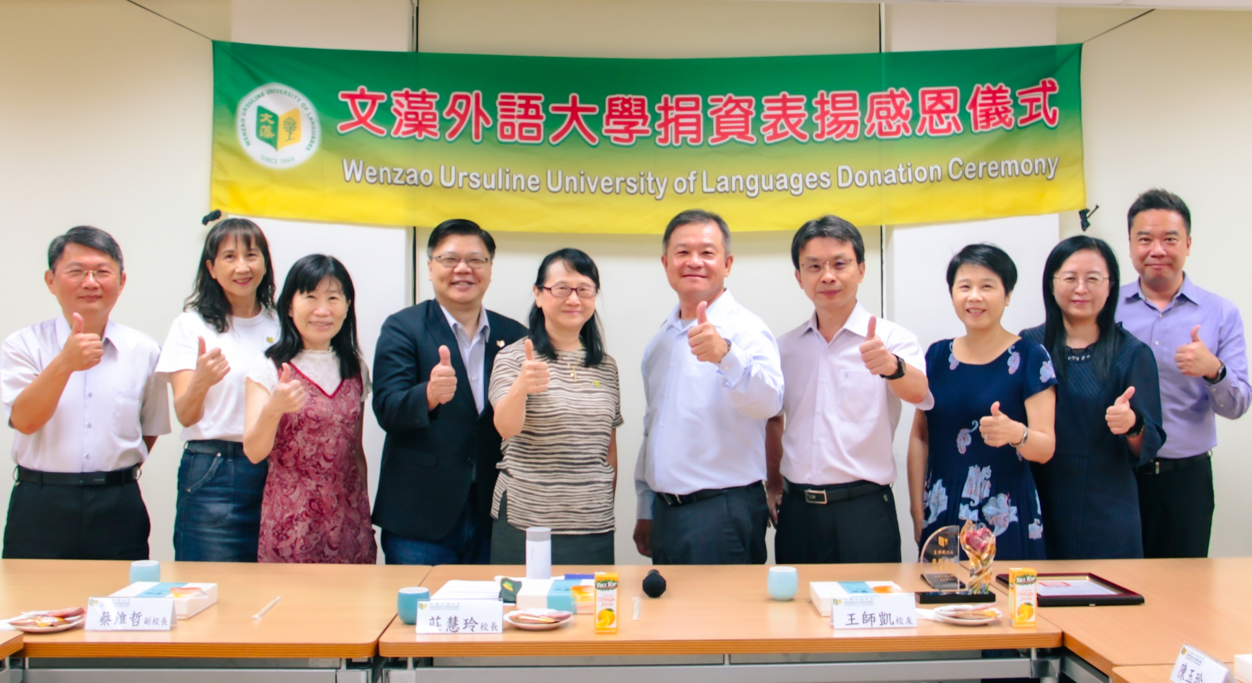 文藻外大英文系王師凱校友(右五),慷慨捐贈新台幣300萬元,協助母校推動人工智慧相關事務,造福校內教職員及學生。相片攝影/公關室