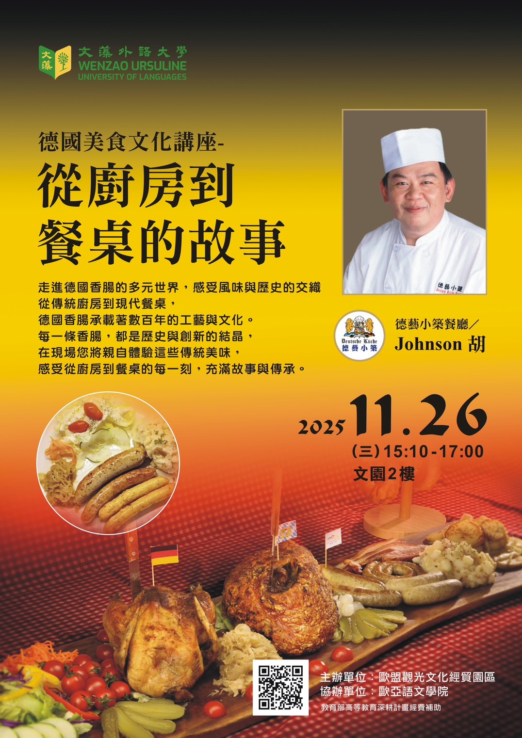 邀請參加歐盟園區專題演講「德國美食文化講座-從廚房到餐桌的故事」— 走進德國香腸的風味旅程(11/26、15:10~17:00)