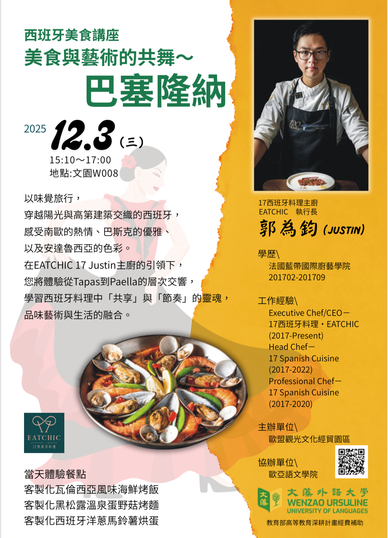 邀請參加歐盟園區專題演講「西班牙美食講座-美食與藝術的共舞~巴塞隆納」 (12/3、15:10~17:00)