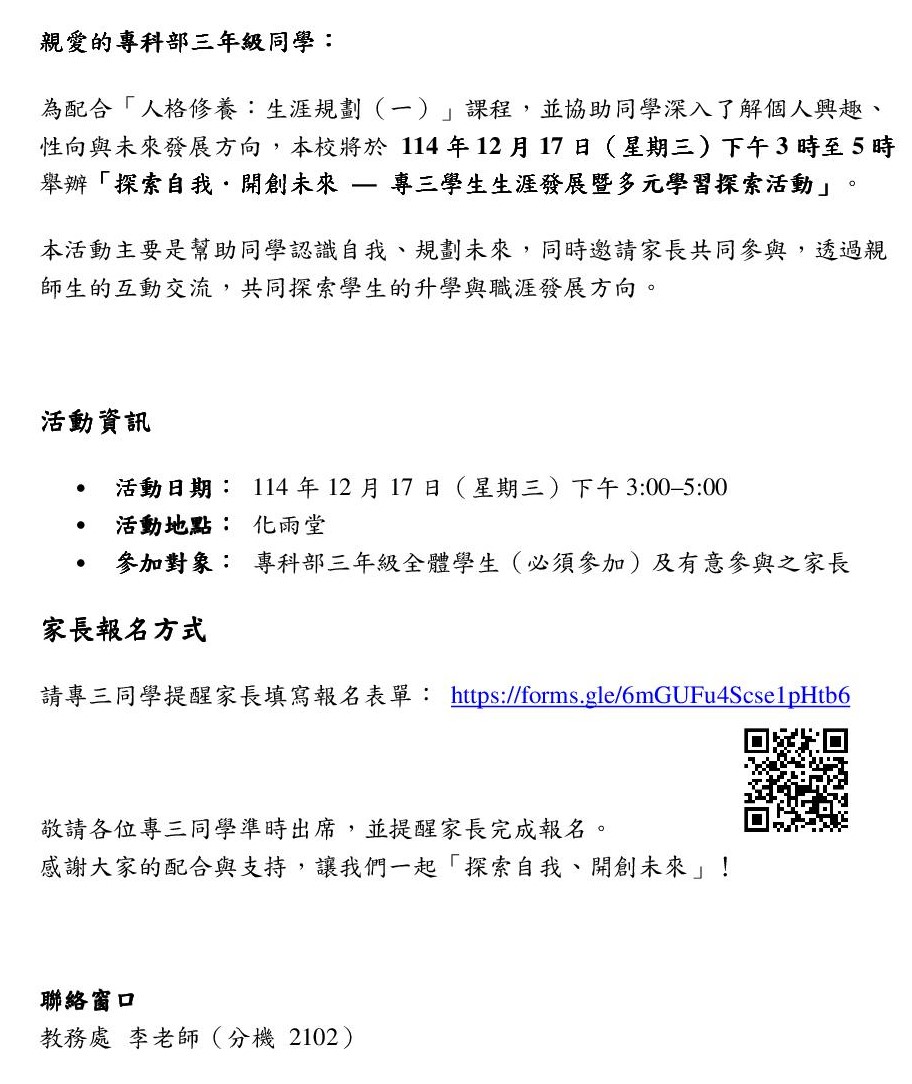 【 專三同學注意!】「探索自我.開創未來 — 專三學生生涯發展暨多元學習探索活動」 即將登場!