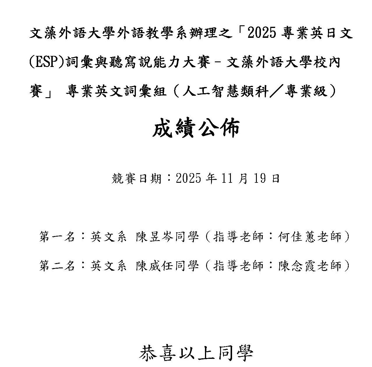 ※成績公布※2025專業英日文(ESP)詞彙與聽寫說能力大賽–文藻外語大學(校內賽) 專業英文詞彙組
