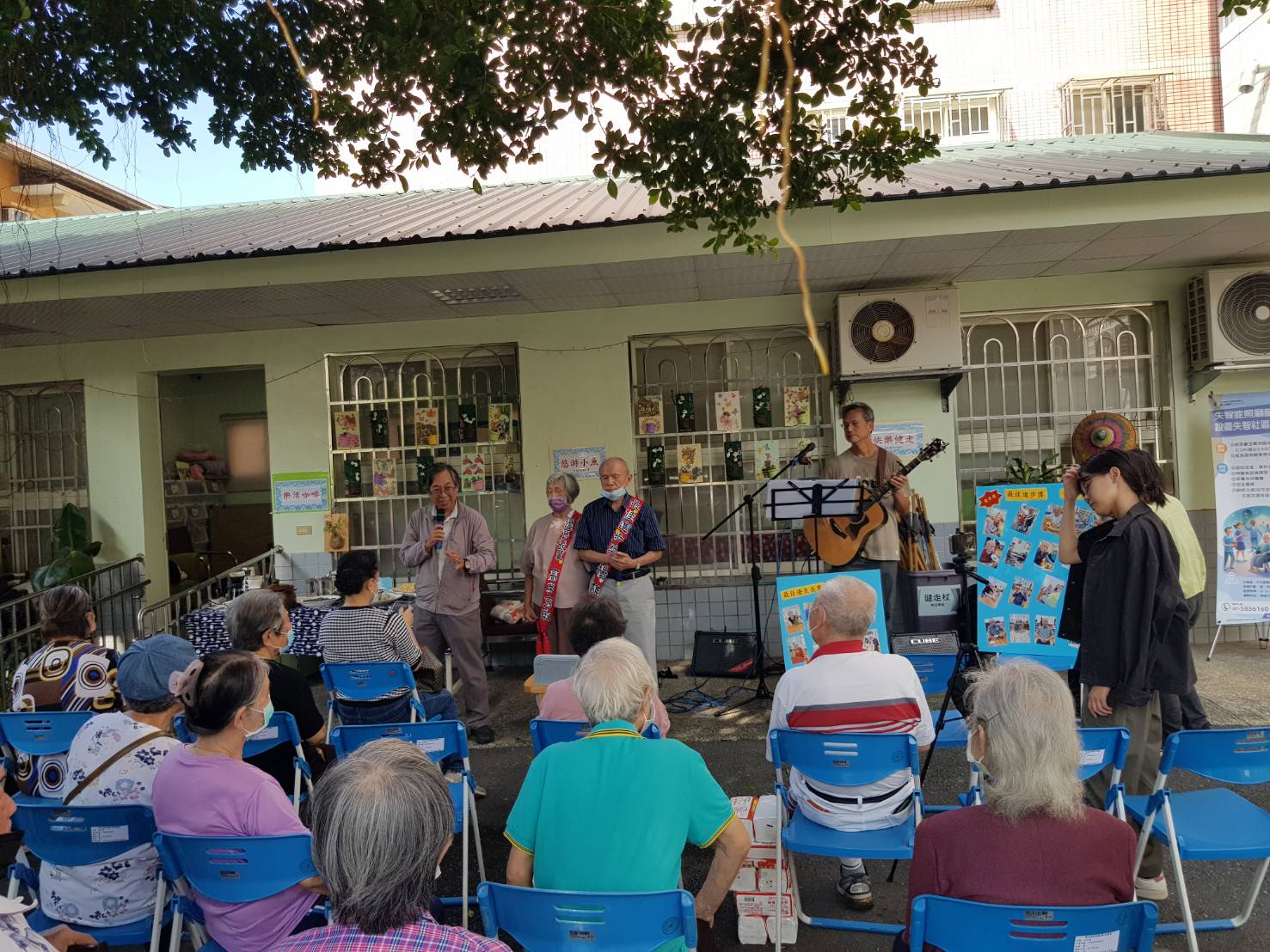文藻蔡介裕研發長(前站立左1)致詞,肯定跨世代交流與社區合作。 |