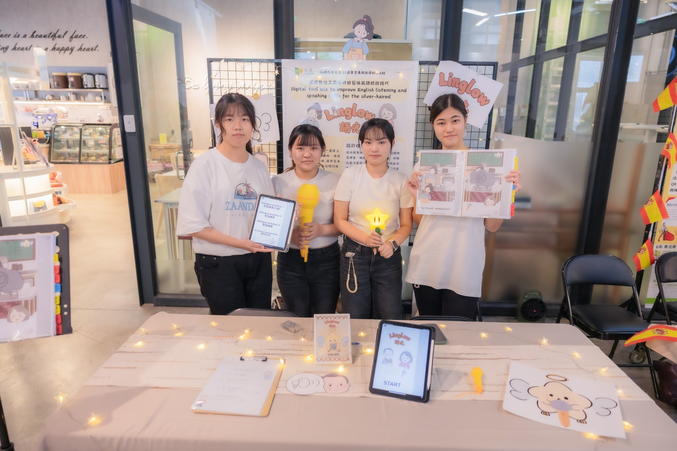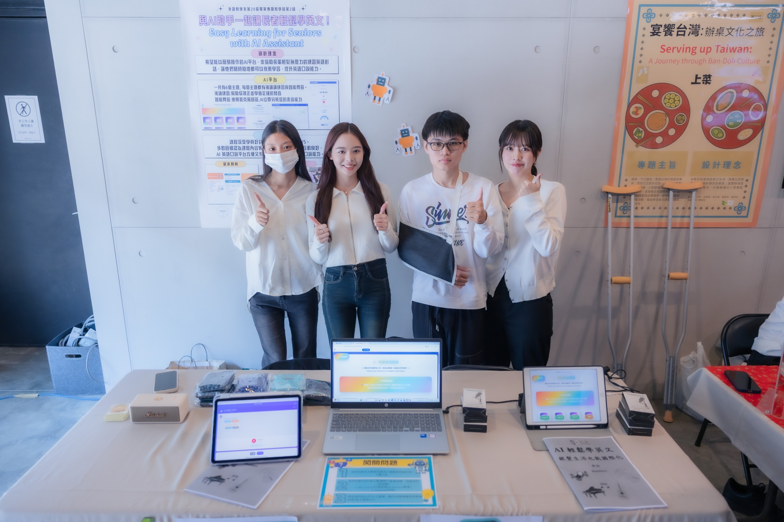 本屆成果展作品兼具實用性與趣味性,其中包括運用卡牌與動態影片設計的西班牙語入門遊戲化學習專題,讓初學者在輕鬆情境中建立語感;也有專題結合AI科技,利用語音辨識與對話模擬工具,協助銀髮族學習英語。還有同學把台灣獨有的辦桌文化製作成教材,用英語呈現每道菜的特色與做法,讓外國人也能近距離感受到台灣味。