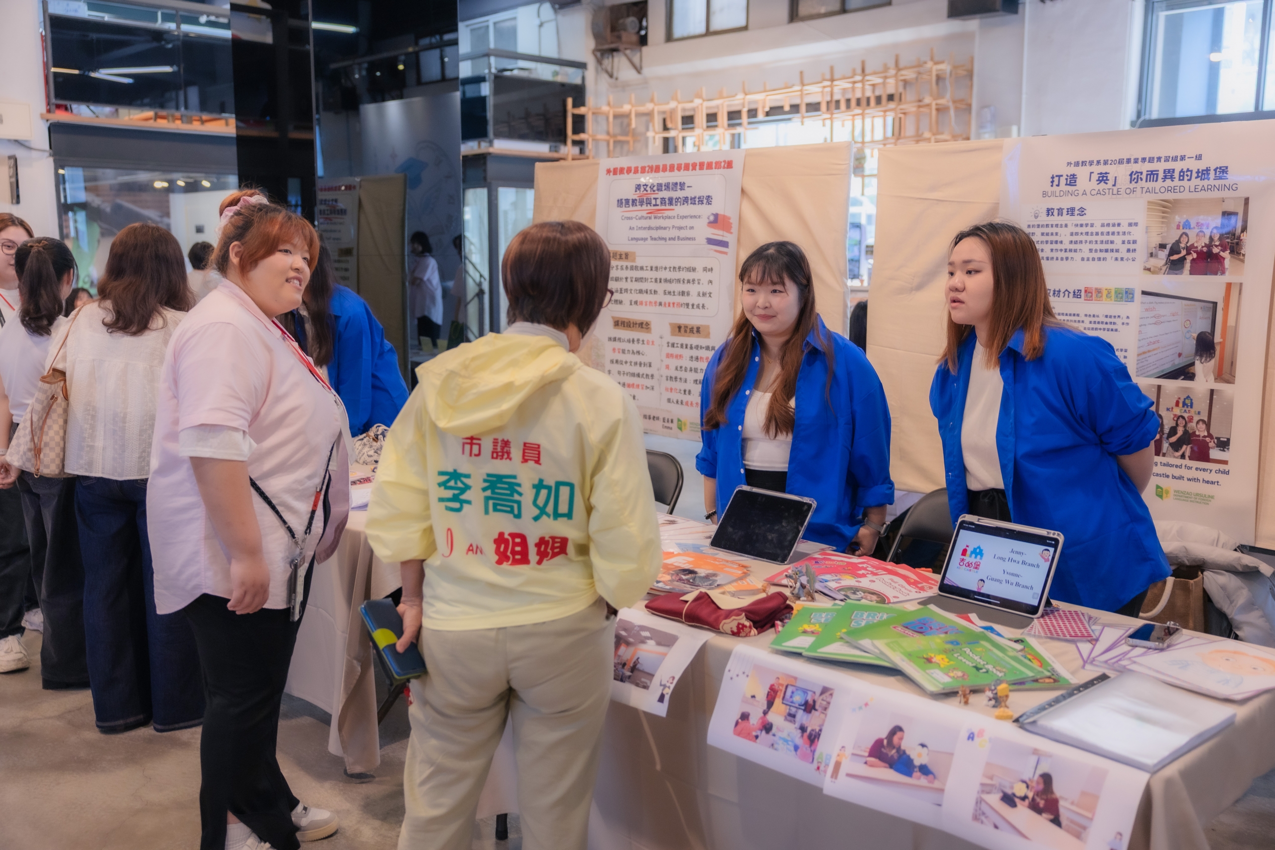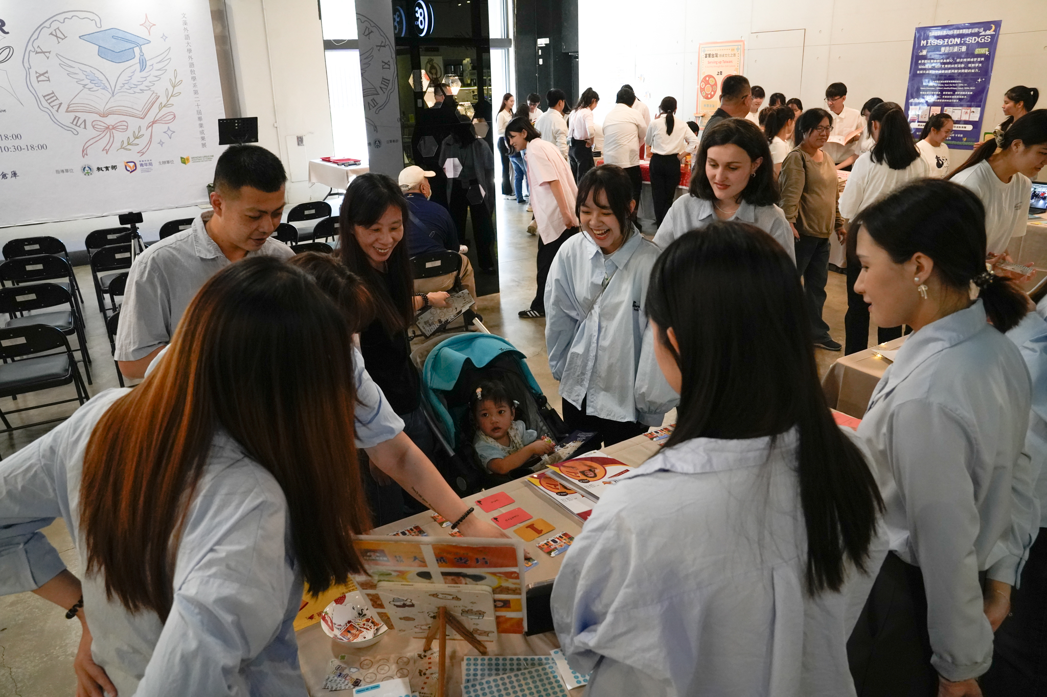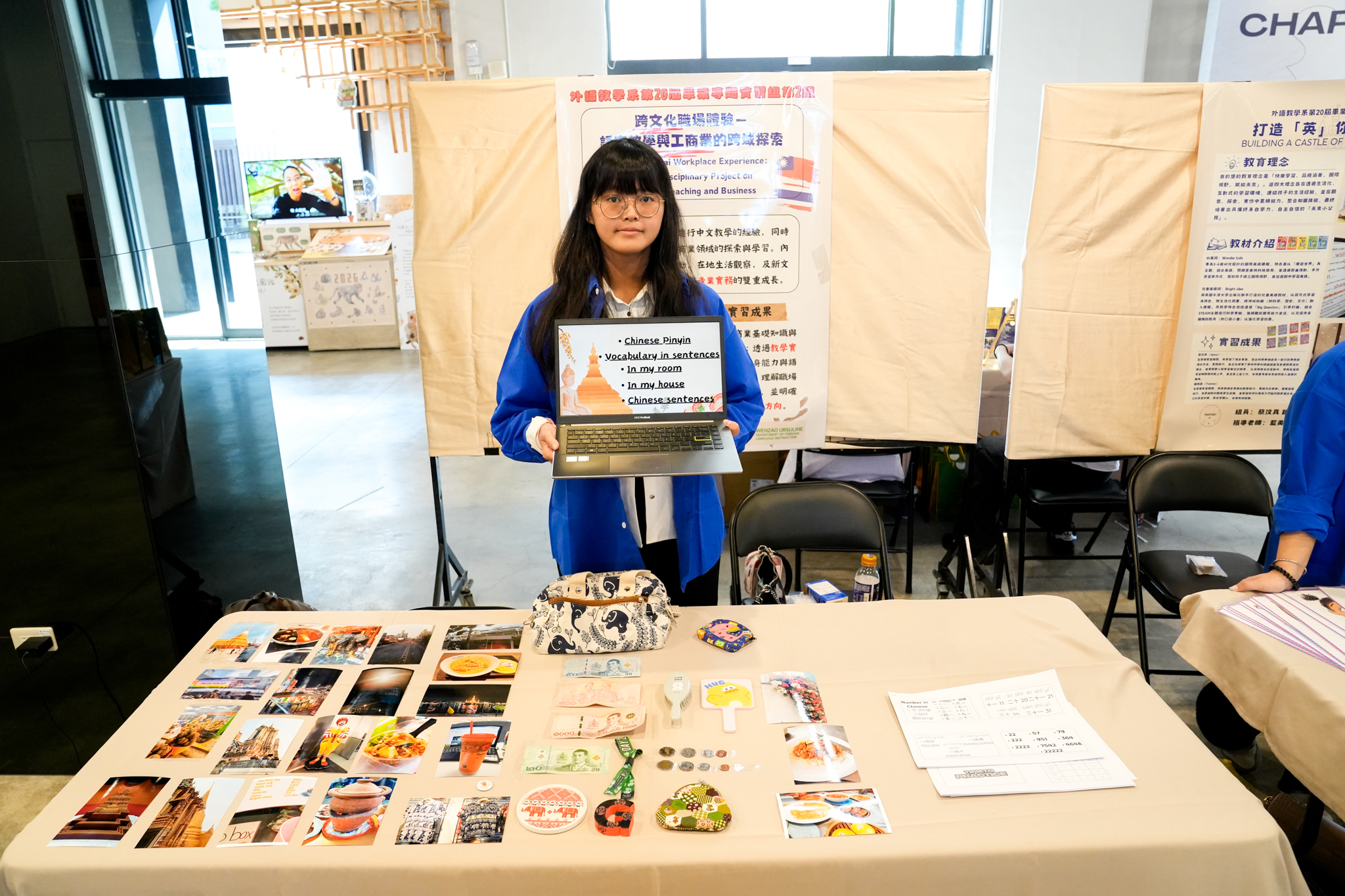 此外,展覽也呈現學生在真實教學現場的專業實踐成果,包括在國內兒童英語機構實習,以及海外華語教學經驗,透過展覽完整呈現課堂管理、課程設計及跨文化溝通能力,展現具彈性與創造力的教學模式。展覽現場設有互動體驗區,包括銀髮英語遊戲、西班牙語入門任務及環保雙語闖關遊戲,讓參觀者親自體驗語言教材的趣味與實用性。