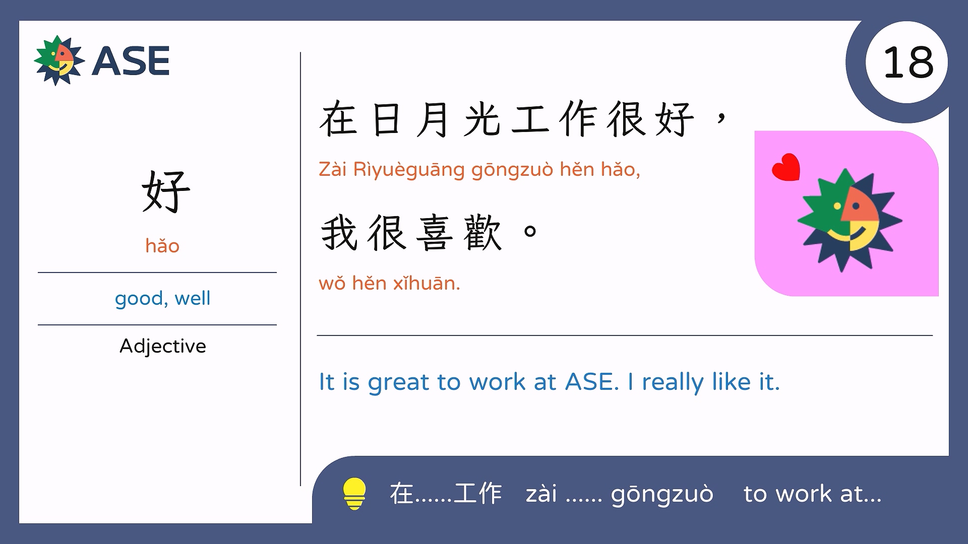 《輕鬆學華語》教材內容涵蓋「漢語拼音」與「初級生活及職場華語」二大主題,各包含10個單元,以真實場域為設計核心,涵蓋半導體廠區的職場溝通需求及在台生活情境,量身打造客製化內容。包括同儕協作職場用語,同時結合就醫、交通、購物與社交等日常情境,協助外籍員工提升華語實用能力。教材以動畫影音呈現,製作超過百支高畫質教學影片,並搭配互動式評量,讓學員在短時間內達到「聽得懂、說得出」的學習成效。