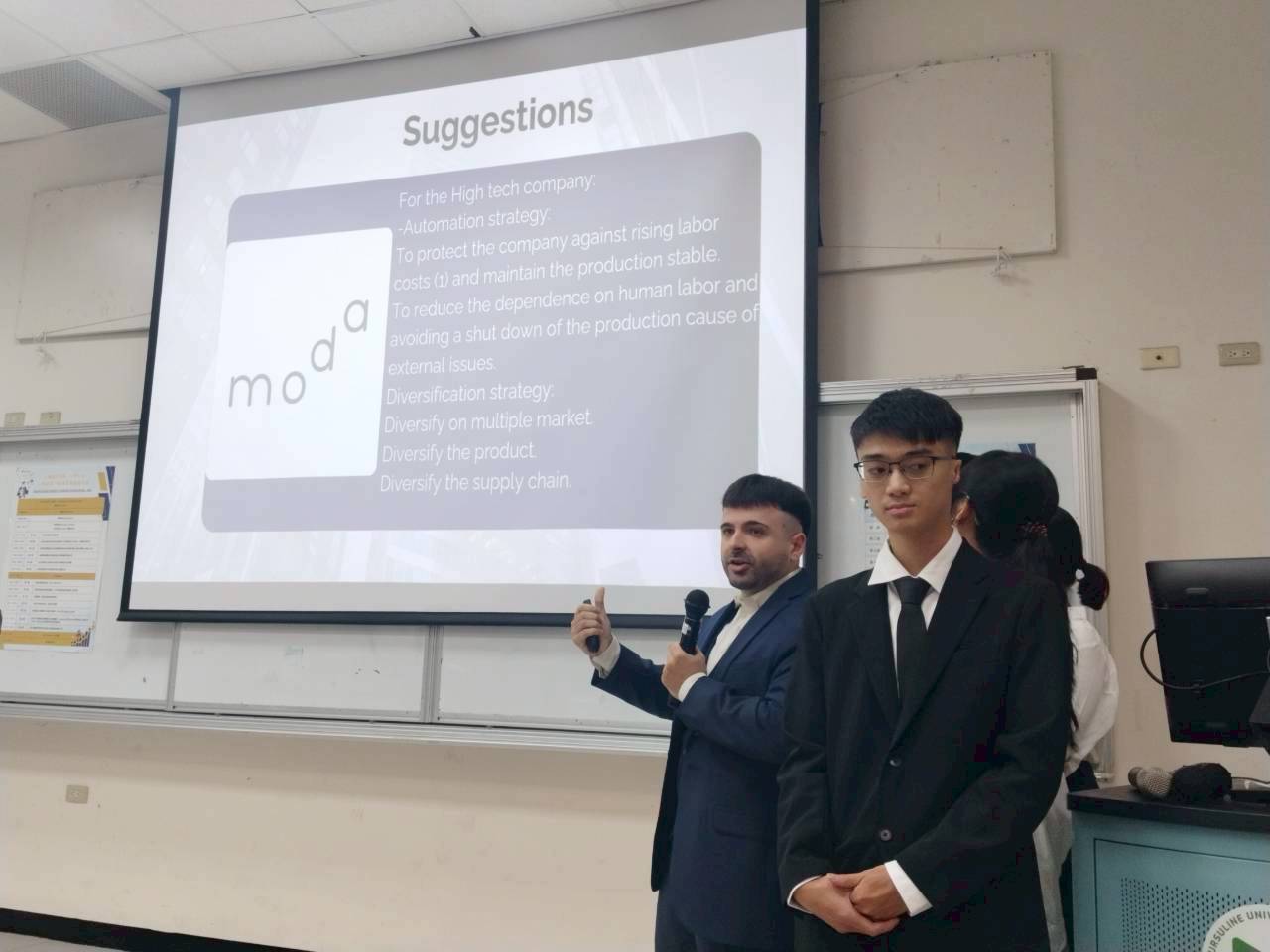 此次專題競賽採書面報告與口頭發表雙軌進行,邀請學界專家評審,包括國立中山大學行銷傳播管理學系教授張榮華、國立屏東科技大學企業管理系教授蔡展維,以及文藻外大國際企業管理系兼任教授蔡正飛擔任評審。張榮華教授表示,首次踏入文藻校園,對學生以非母語流暢報告感到驚豔。此次題目多元、製作精緻,展現高度專業。蔡展維教授則提醒學生,專題是累積實務經驗的重要機會,業界重視的不只是學歷,更看重大學期間的實際表現。蔡正飛教授建議學生善用對比、圖片與分析工具,提升論述完整性與簡報流暢度。