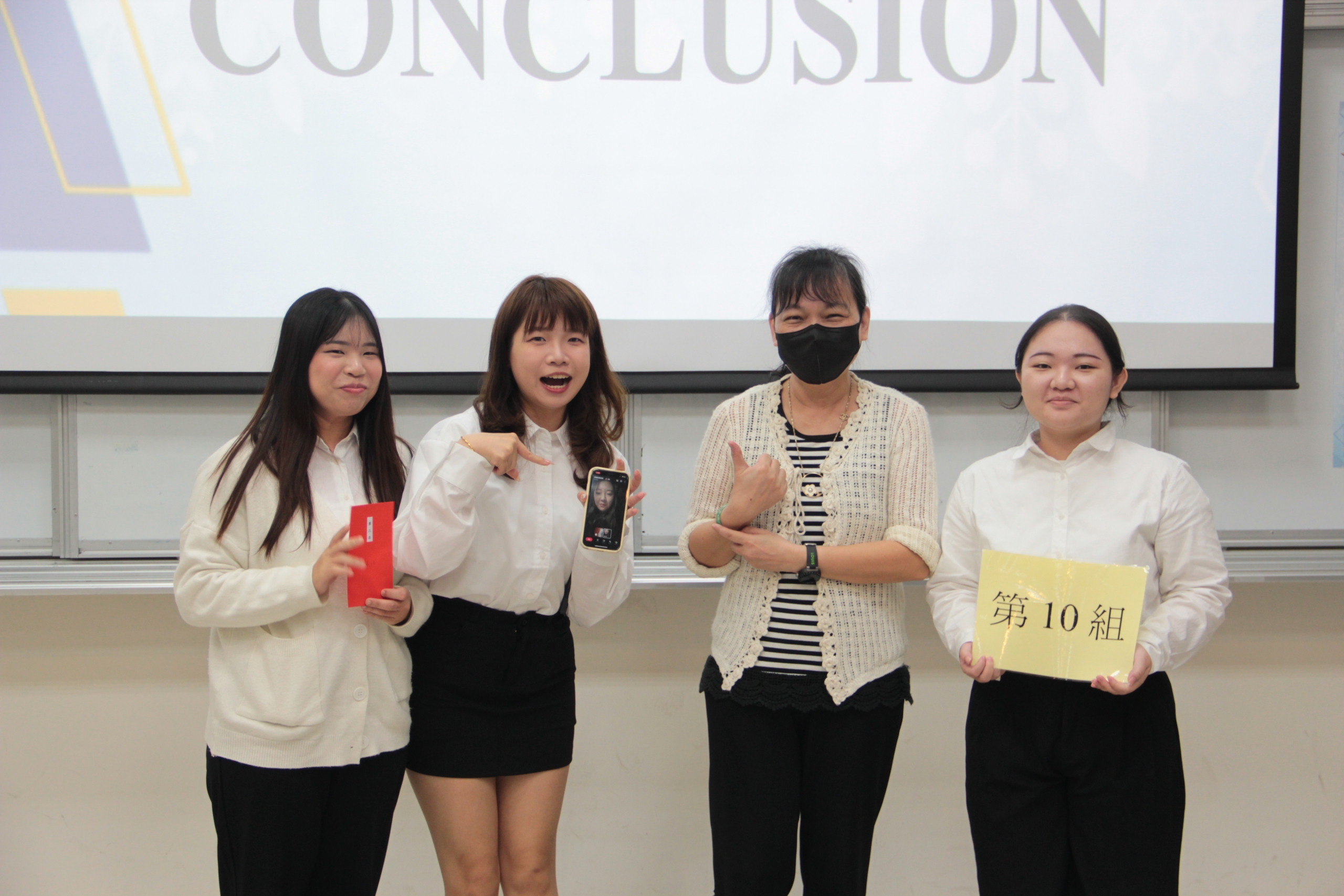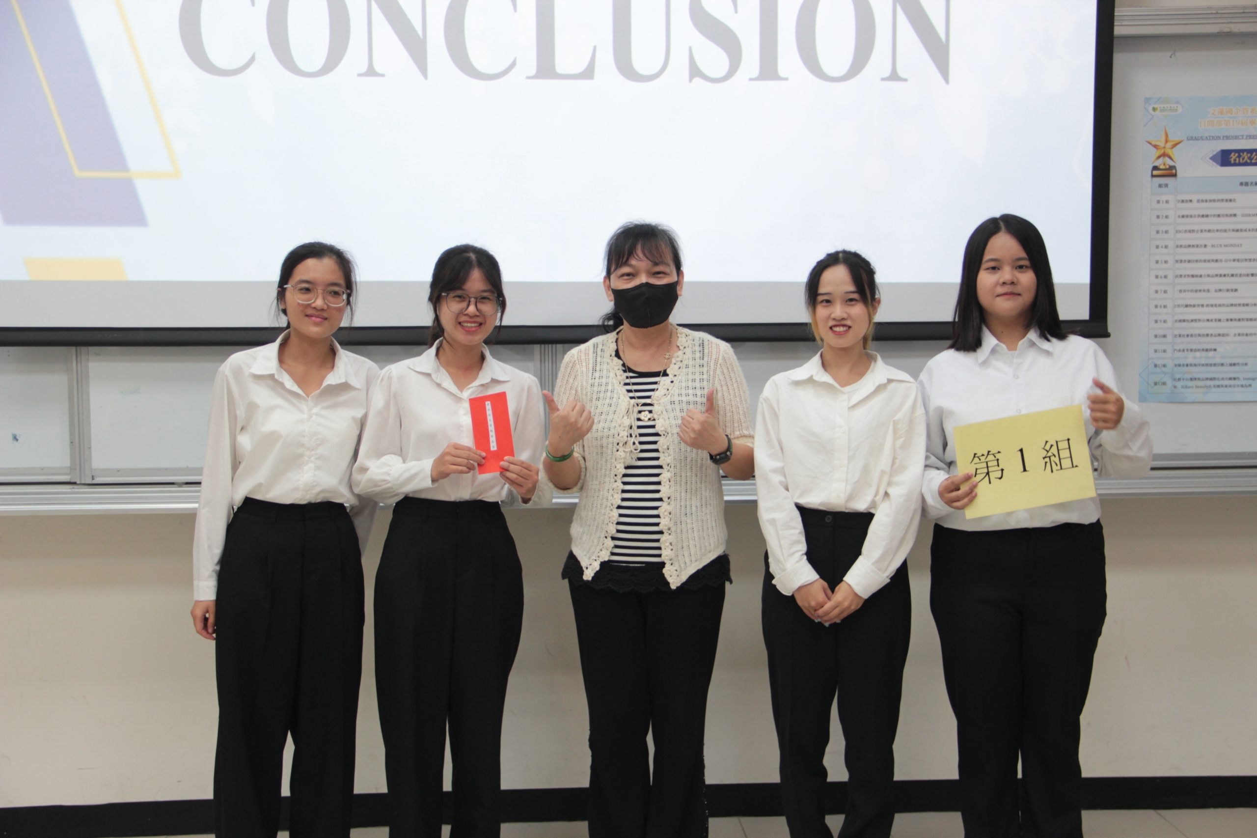 第三名獲獎專題團隊合影,圖右二為國企管系曹淑琳主任。 |