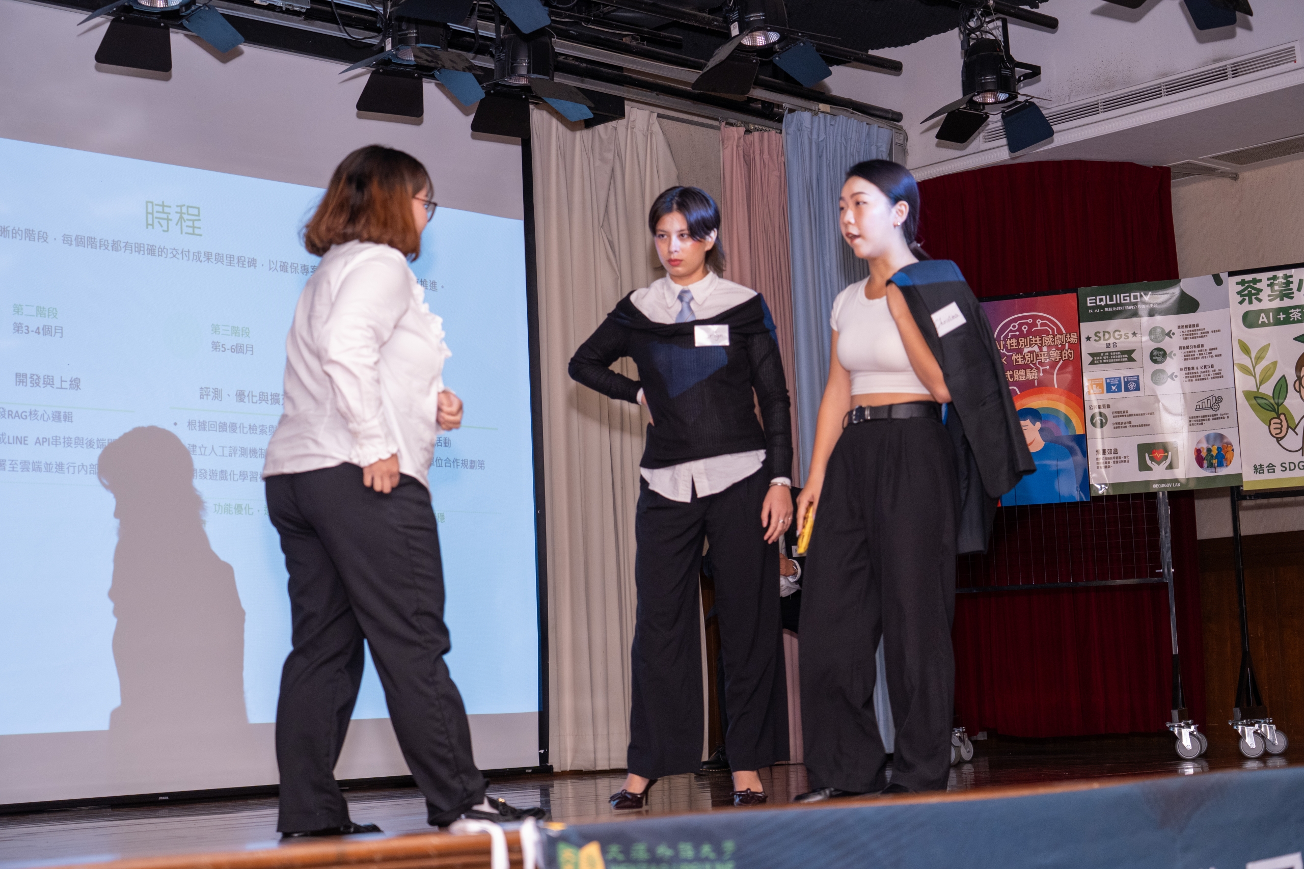 三位決賽評審也提出建議,通識教育中心教師章之平提醒學生,提出AI解方前必須先深入理解問題成因,確實查核資料來源。他並以拍片經驗比喻,要從不熟悉到熟悉,作品才會有說服力。傳播藝術系教師蔡翔則建議,深化技術整合能提升方案落地性。數位內容應用與管理系副教授蘇彥衍強調簡報表達的重要性,包含資訊傳遞的清楚度、字詞精準與眼神交流等細節,都是提升溝通效果的關鍵。