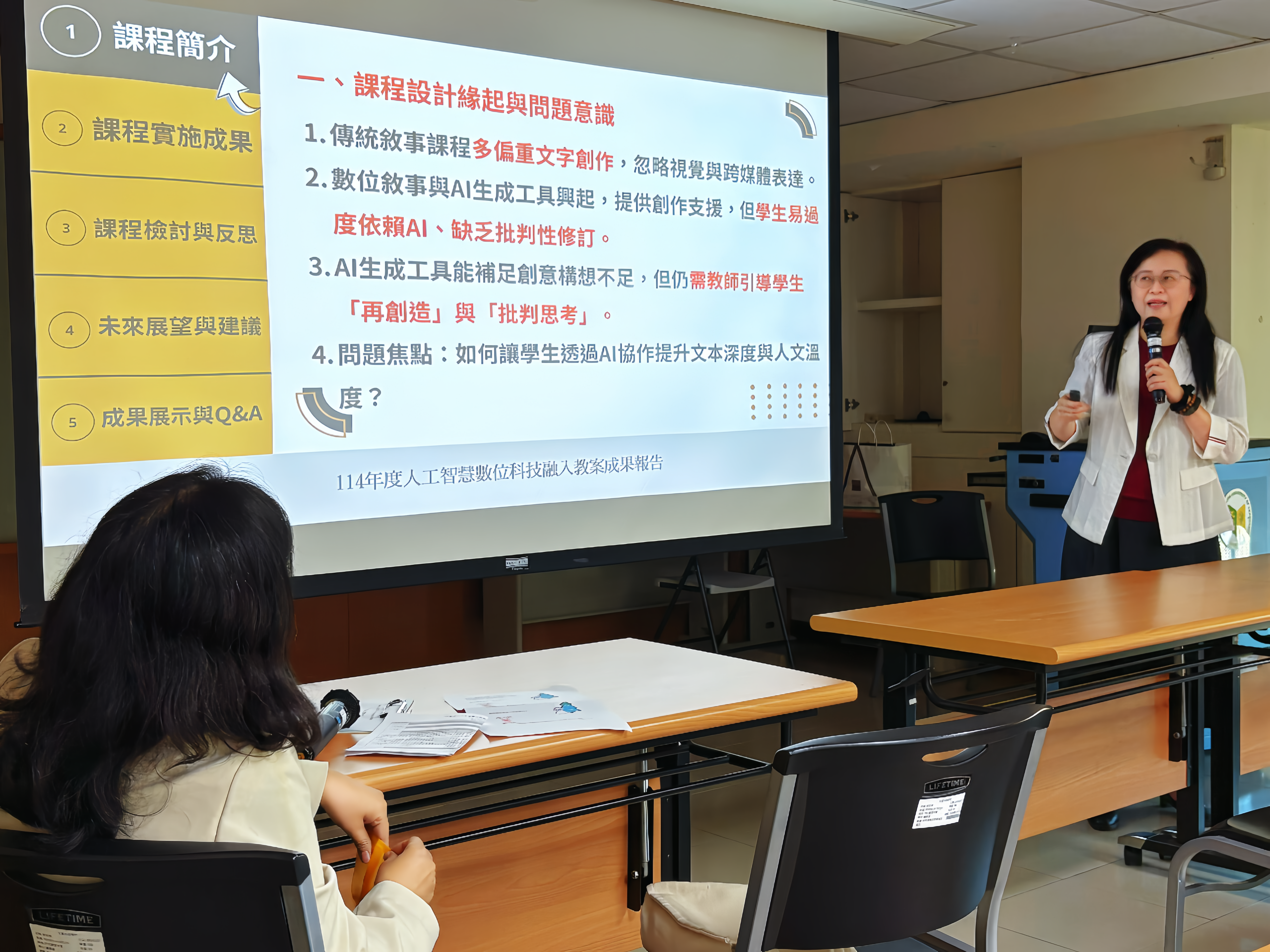 戴俊芬副教務長(右)進行AI賦能數位敘事教案分享 |
