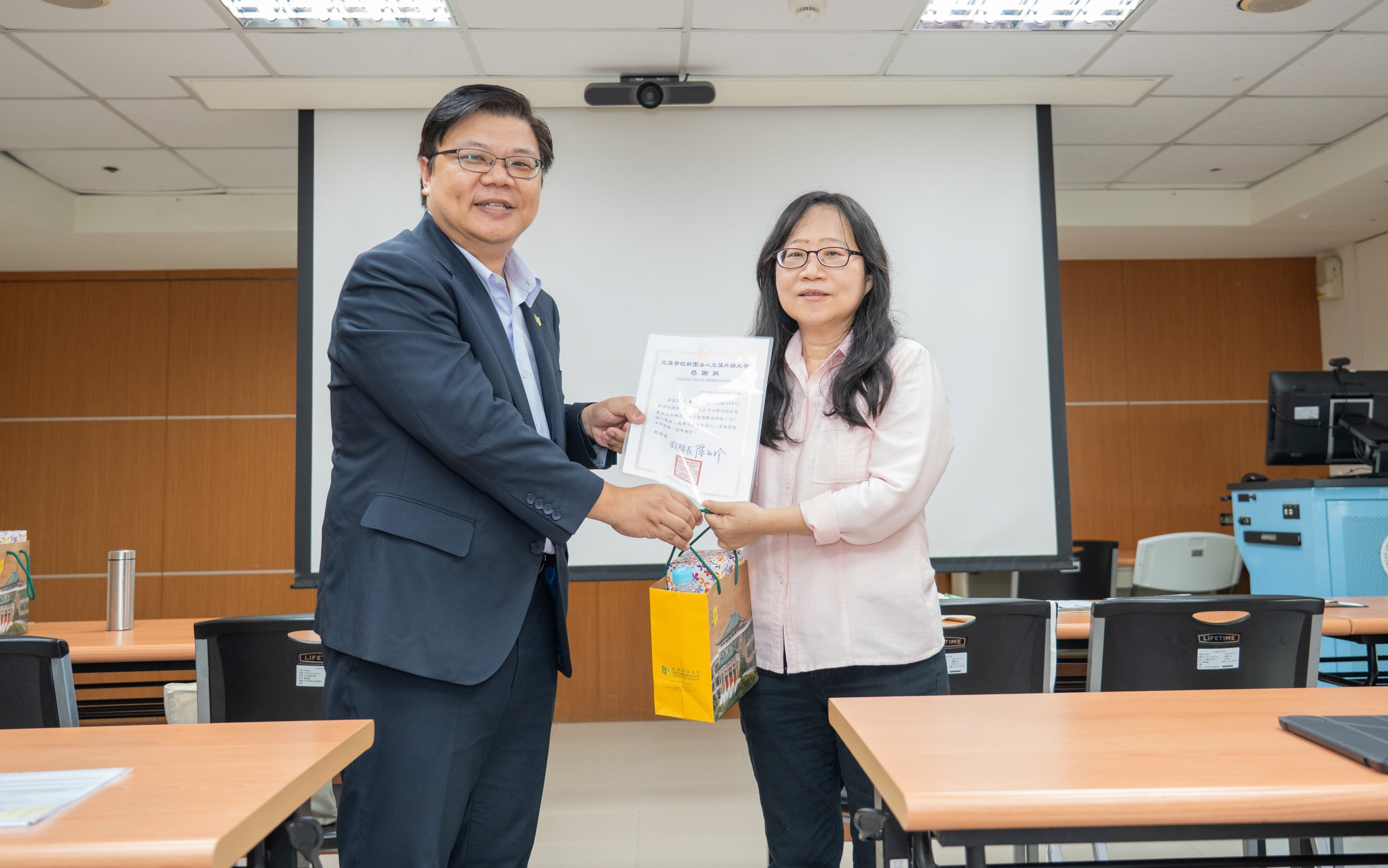 蔡維哲副校長(左)頒贈分場主持人羅宜柔教授(右)感謝狀及禮品 |
