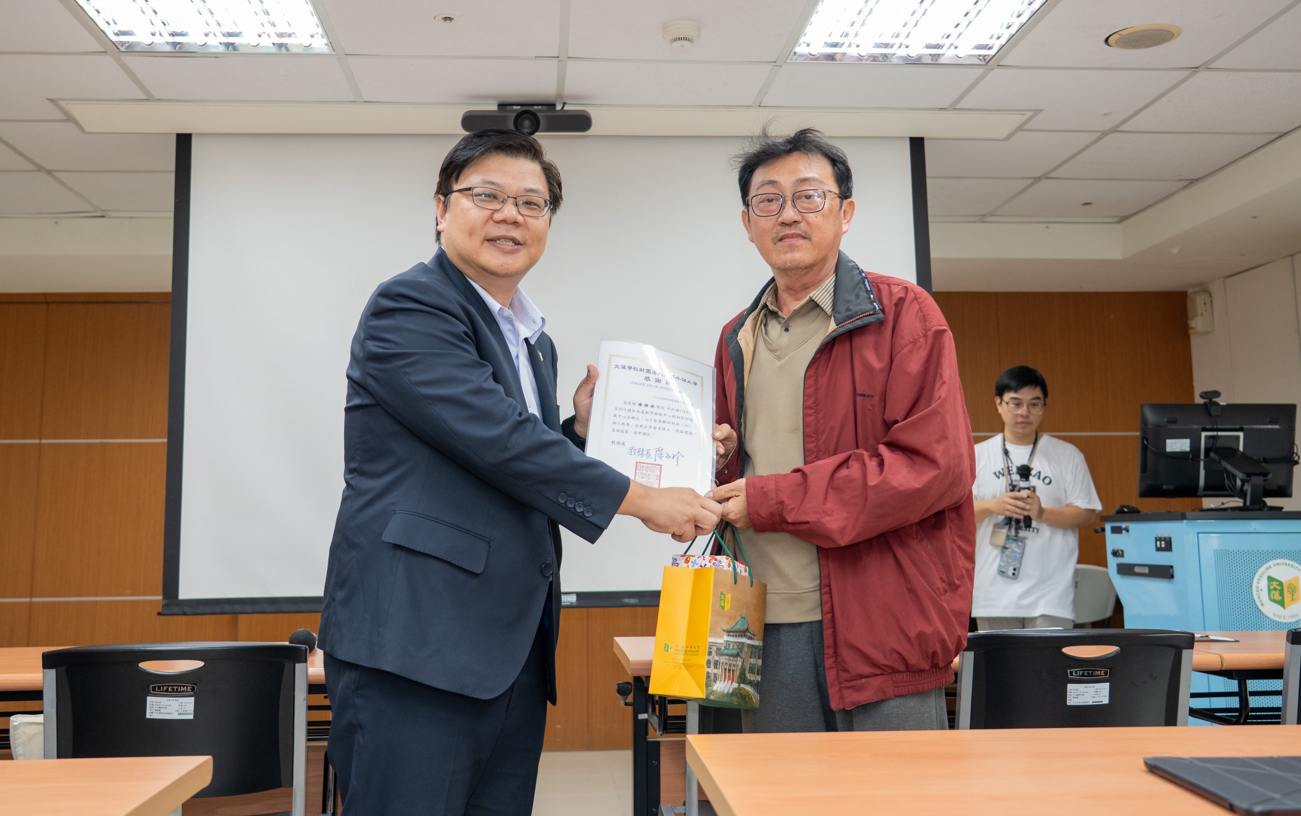 蔡維哲副校長(左)頒贈分場主持人楊雄斌教授(右)感謝狀及禮品 |