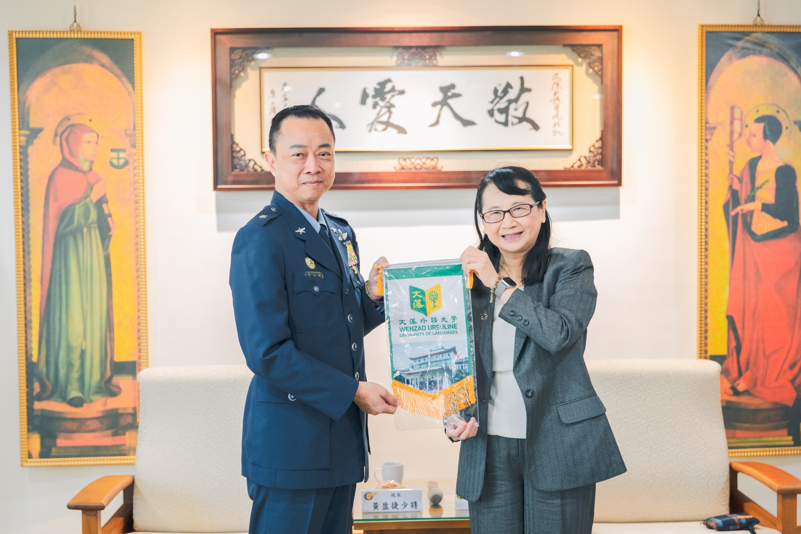 空軍官校校長黃盈捷則在致詞時指出,空軍為高度科技化且須與國際接軌的軍種,因此外語能力是軍官不可或缺的關鍵工具。空軍官校過去與文藻已有良好交流基礎,尤其近期透過英語歌唱比賽合作,更加感受到文藻師生的專業與熱情,成為促成此次結盟的重要契機。他期盼雙方未來能持續深化合作,攜手培育兼具專業實力、國際視野與責任感的新世代人才。