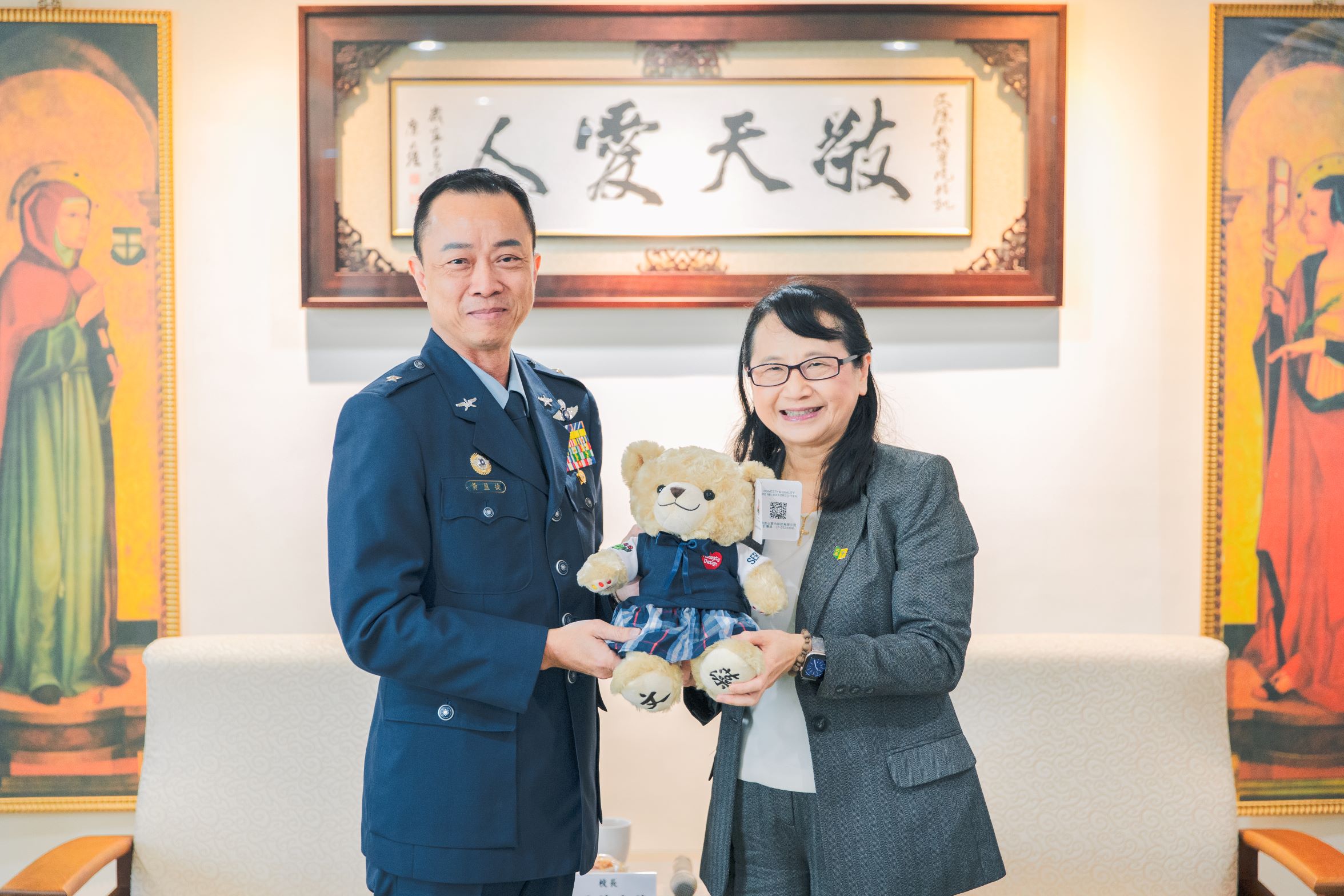文藻莊慧玲校長(右)致贈吉祥物「文藻熊」予空軍官校黃盈捷校長(左),象徵兩校交流合作情誼。 |