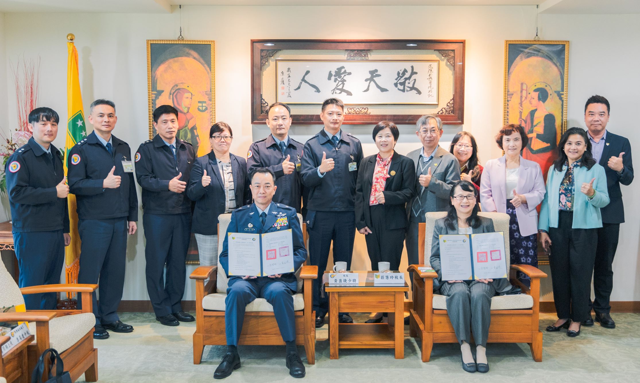 文藻外語大學與空軍官校完成締約後,與會人員合影留念,見證兩校合作交流的重要時刻。 |