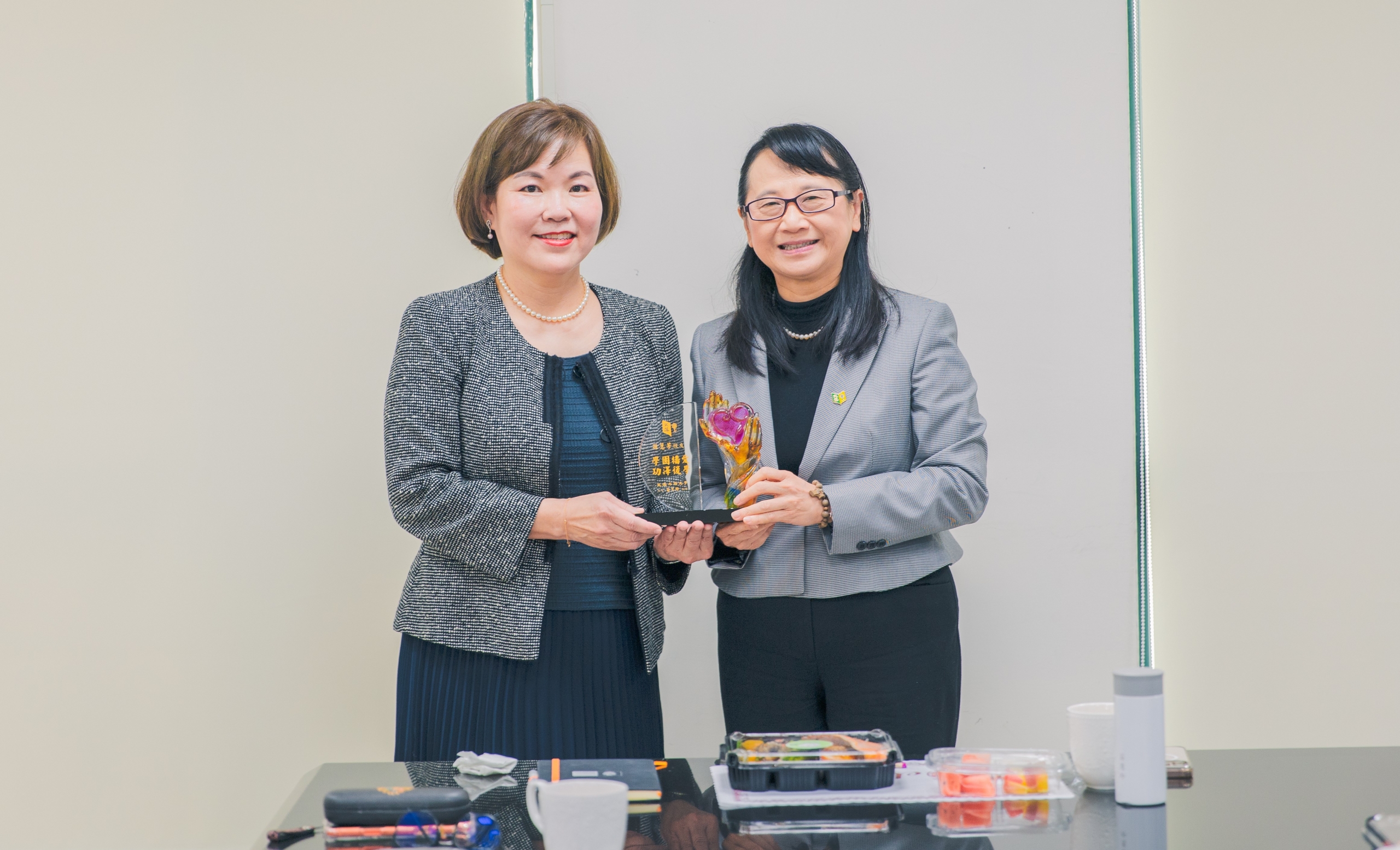 莊慧玲校長(右)頒贈紀念獎座予孫慧芳校友(左) |